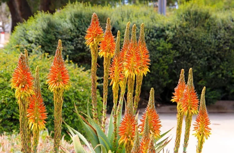 Aloe microstigma通常为无茎或短茎的单生莲座状植物,成年植株高度约60-70厘米,直径约50厘米(偶达1米)。叶片约15-25片,宽阔平展、肉质厚实,长20-50厘米(8-20英寸),宽5-10厘米(2-4英寸),表面光滑蜡质,绿色带红色调,具不规则白色斑点;在强光或干旱下呈红色或粉红色调;边缘有薄薄的粉橙色软骨质边,有小而尖锐的红色齿刺,长约1-2毫米,间隔5-10毫米。叶片排列成开放的莲座状。花序多分枝,从叶丛中心伸出,高约60-100厘米(2-3英尺),平顶状;总状花序圆柱形,长约20-30厘米(8-12英寸);花朵红色或橙色,长约3-4厘米(1.2-1.6英寸),管状,密集排列成几何状,如烟花。花期主要在南半球冬季(约6-8月)。果实为蒴果,长圆形,长约2厘米,直径1厘米;种子有翅。植株整体生长缓慢,长寿,变异性主要在叶色从绿到红粉,取决于光照和温度。