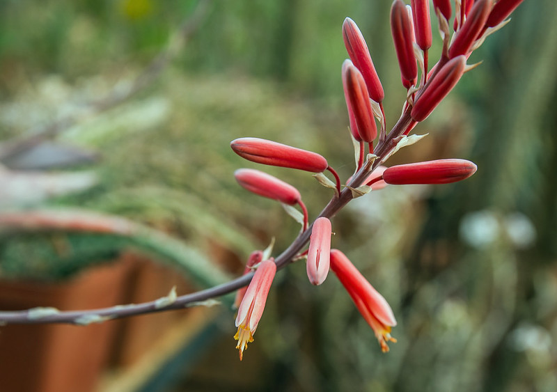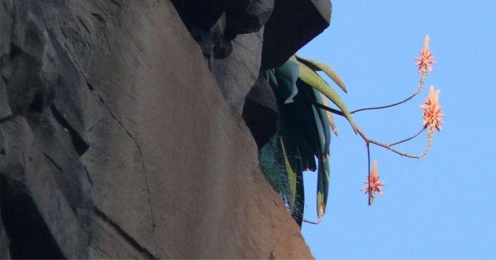 Aloe omavandae通常为单生或形成小簇的悬崖栖息植物,茎长达4米,通常下垂(pendulous),但有时直立或匍匐(prostrate),直径约5-10厘米。叶丛下垂,灰绿色叶片有浅斑点,长约40-60厘米(16-24英寸),宽4-6厘米(1.6-2.4英寸),表面光滑蜡质,边缘有小而尖锐的棕色牙齿,长约1-2毫米,间隔5-10毫米。叶片肉质厚实,用于储存水分,在干旱或强光下可能卷曲或呈红色调。花序从叶丛中心伸出,高60-80厘米,分支4-12枝;总状花序圆柱形,长约20-30厘米(8-12英寸);花朵暗红色,长28毫米,覆盖短软毛(pubescent),密集排列。花期主要在南半球夏季(约12-2月)。果实为蒴果,长圆形,长约2厘米,直径1厘米;种子有翅。植株整体生长缓慢,长寿,变异性主要在叶色从灰绿到红调,取决于光照和水分。