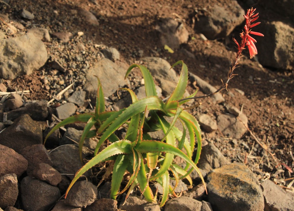 Aloe acutissima var. fiherenensis通常为灌木或小树,高2-4米(6-13英尺),茎短而粗壮,直径约10-15厘米。叶丛密集,约15-25片叶片,狭窄披针形,长约30-50厘米(12-20英寸),宽4-6厘米(1.6-2.4英寸),表面光滑蜡质,绿色或浅蓝色,在干旱或强光下呈红色调;边缘有红色三角形齿,长约2-4毫米,间隔10-15毫米。叶片排列成开放的莲座状,常在坡面下垂。花序从叶丛中心伸出,高约60-100厘米,多分枝;总状花序圆柱形,长约20-30厘米(8-12英寸);花朵红色,长约3-4厘米(1.2-1.6英寸),管状密集排列。花期主要在南半球夏季(约12-2月)。果实为蒴果,长圆形,长约2厘米,直径1厘米;种子有翅。植株整体生长快速,长寿,变异性主要在叶色从绿到红调,取决于环境。