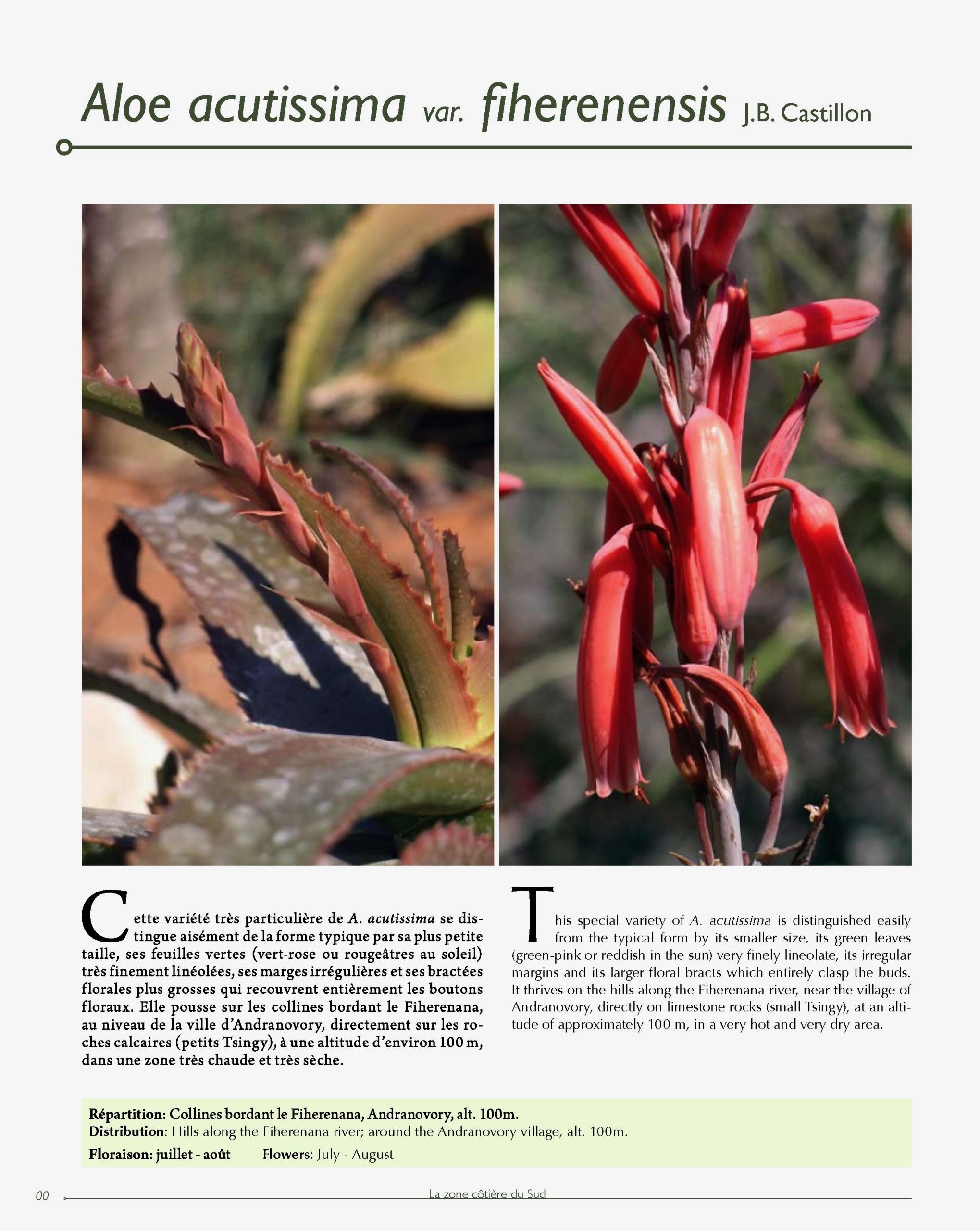 是一种马达加斯加西南部特有芦荟属植物变种,原产于该岛托利亚拉省(Toliara Province)的Fiherenana河沿岸。它是一种快速生长的灌木或小树,高达4米(13英尺),茎短而粗壮,枝条持有狭窄的绿色或浅蓝色叶丛。该变种于2007年由Jean-Bernard Castillon在Succulentes期刊中首次描述,与典型var. acutissima相比,叶片更宽大,常在压力下呈红色调。作为一种岩生适应植物,它生长在石灰岩丘陵和小型Tsingy上,适合作为观赏芦荟栽培,尤其在岩石花园或容器中,但野生种群易受栖息地破坏影响,已被评估为易危,需要优先选择人工繁殖来源以支持保护。