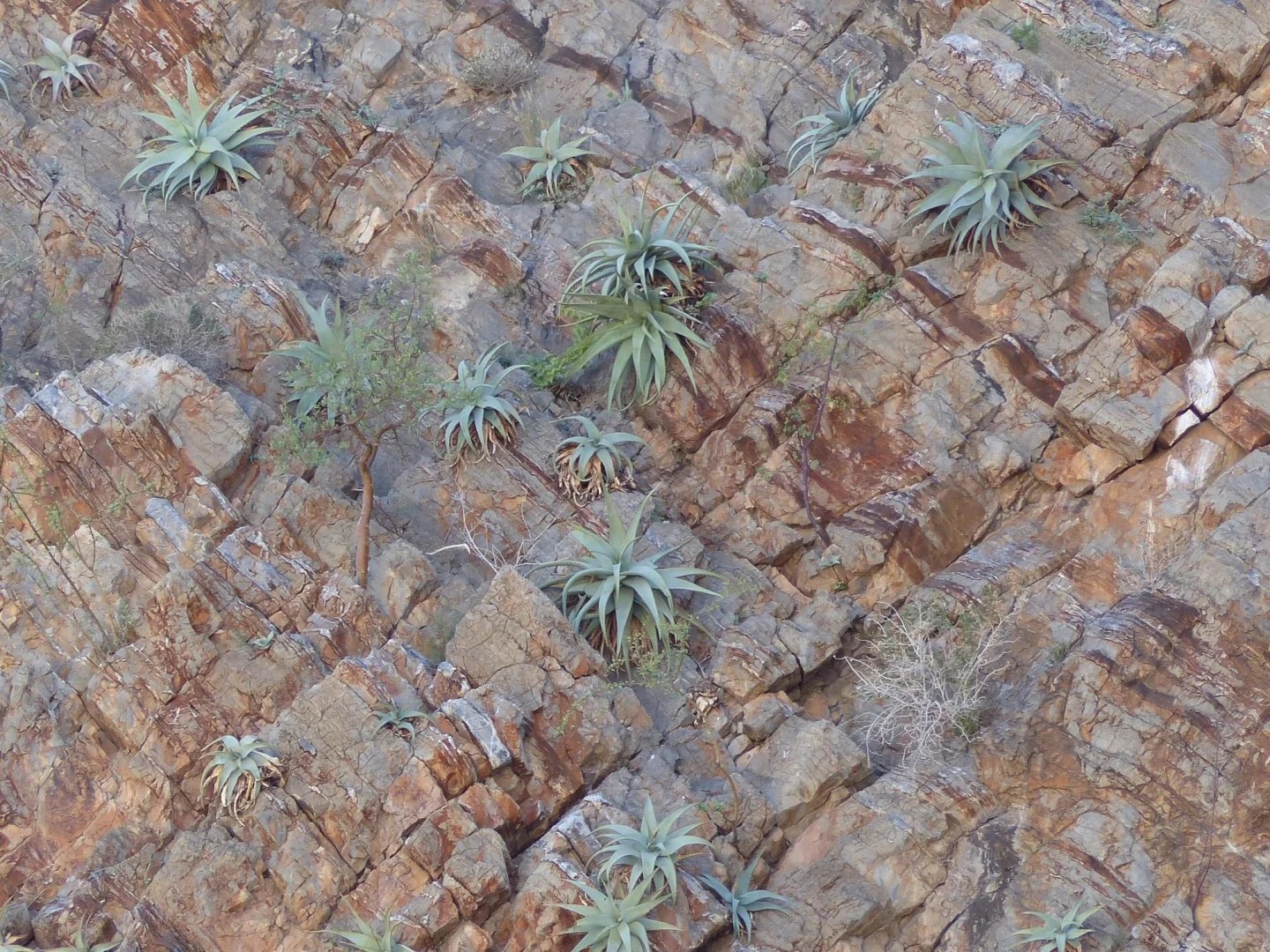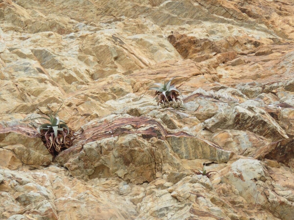 Aloe dewinteri主要分布在纳米比亚西北部的Kaokoveld地区,包括Baynes Mountains和Otjihipa Mountains,生长在岩石裂缝和陡峭崖壁上,海拔约1000-1500米。这些栖息地为干燥的稀树草原或半荒漠生物群系,土壤贫瘠岩质,排水良好,年降雨量较高(相对于纳米比亚其他地区,约500-800毫米),主要集中在雨季,旱季漫长高温,高雨量但快速排水。该植物常出现在阳光充足的坡面,与纳米比亚其他耐旱植物如Lavrania haagnerae共生,形成小群落。分布范围狭窄,总面积估计不到500平方公里,导致其对栖息地干扰敏感。