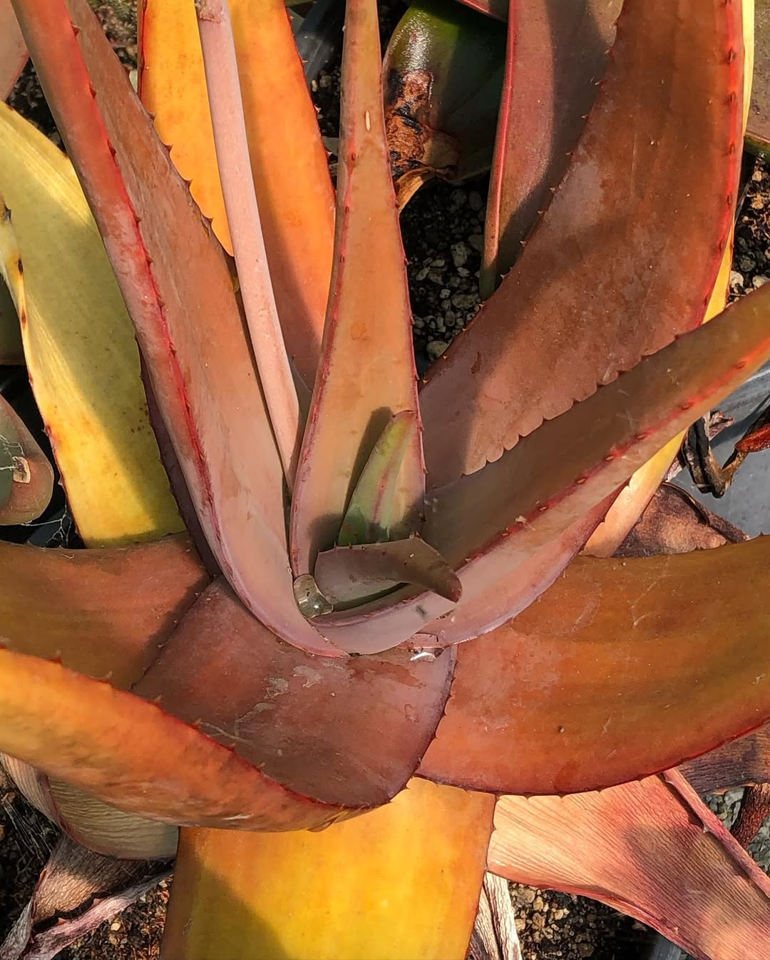 Aloe lavranosii通常为无茎植物,单生或偶有分株,形成莲座状叶丛,直径约30-50厘米(12-20英寸)。叶片宽阔、蓝紫色或灰蓝色,有些可弯曲,渐细,长约20-30厘米(8-12英寸),宽4-6厘米(1.6-2.4英寸),表面光滑蜡质,无斑点;边缘有突出的齿刺,长约1-2毫米,间隔5-10毫米。叶片排列成开放莲座。在干旱或强光下呈红色调。花序从叶丛中心伸出,高约50-70厘米,多分枝;总状花序圆柱形,长约20-30厘米(8-12英寸);花朵红色或黄色,长约2-3厘米(0.8-1.2英寸),管状密集排列,覆盖毛状。花期主要在南半球夏季(约7-8月)。果实为蒴果,长圆形,长约2厘米,直径1厘米;种子有翅。植株整体生长缓慢,长寿,变异性主要在叶色从蓝紫到红调,取决于环境。