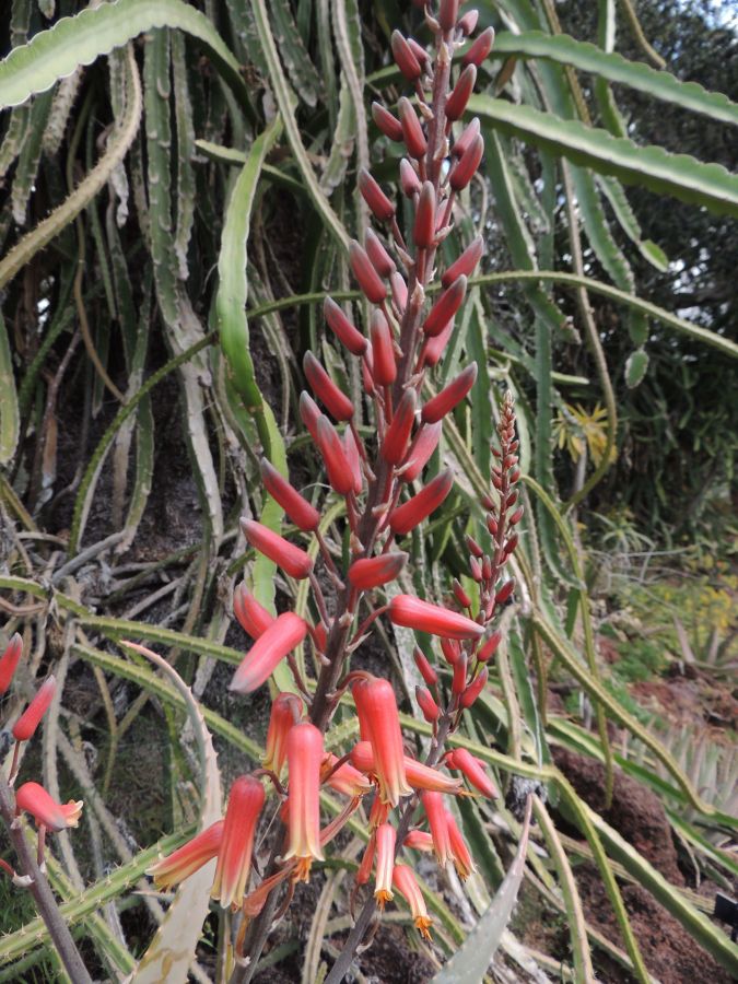 Aloe abyssicola通常为无茎或极短茎的丛生植物,形成下垂莲座状叶丛,直径约20-40厘米(8-16英寸)。叶片约15-25片,宽阔卵形,长约10-20厘米(4-8英寸),宽4-6厘米(1.6-2.4英寸),表面光滑蜡质,灰绿色;在干旱或强光下呈红色调;边缘有小而尖锐的红色齿刺,长约1-2毫米,间隔5-10毫米。叶片排列成开放的莲座状,常倒挂生长以适应崖壁。花序从叶丛中心伸出,高约30-50厘米,不分枝或少分枝;总状花序圆柱形,长约15-25厘米(6-10英寸);花朵红色,长约2-3厘米(0.8-1.2英寸),管状密集排列。花期主要在南半球冬季(约6-8月)。果实为蒴果,长圆形,长约2厘米,直径1厘米;种子有翅。植株整体生长缓慢,长寿,变异性主要在叶色从灰绿到红调,取决于环境。