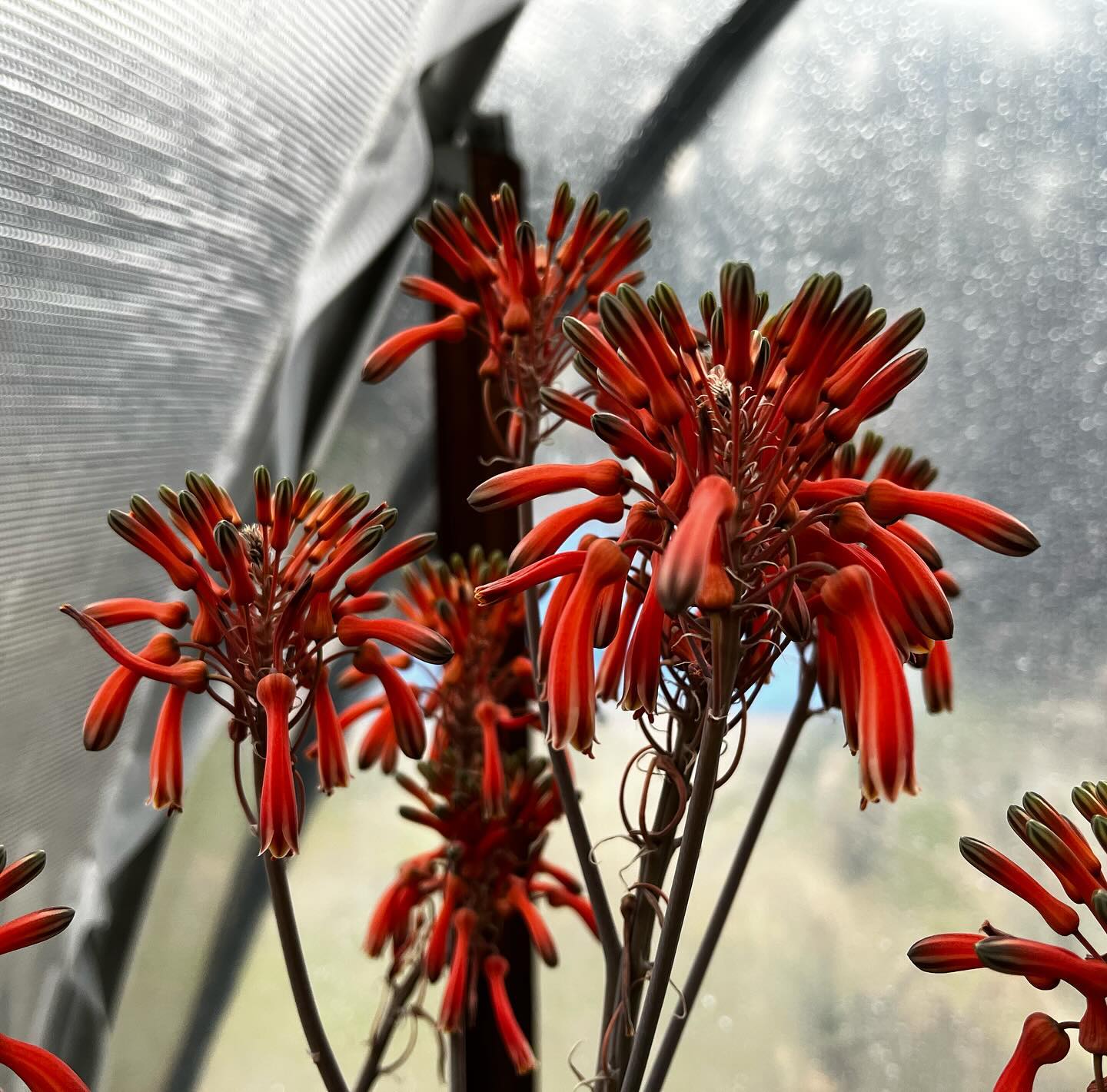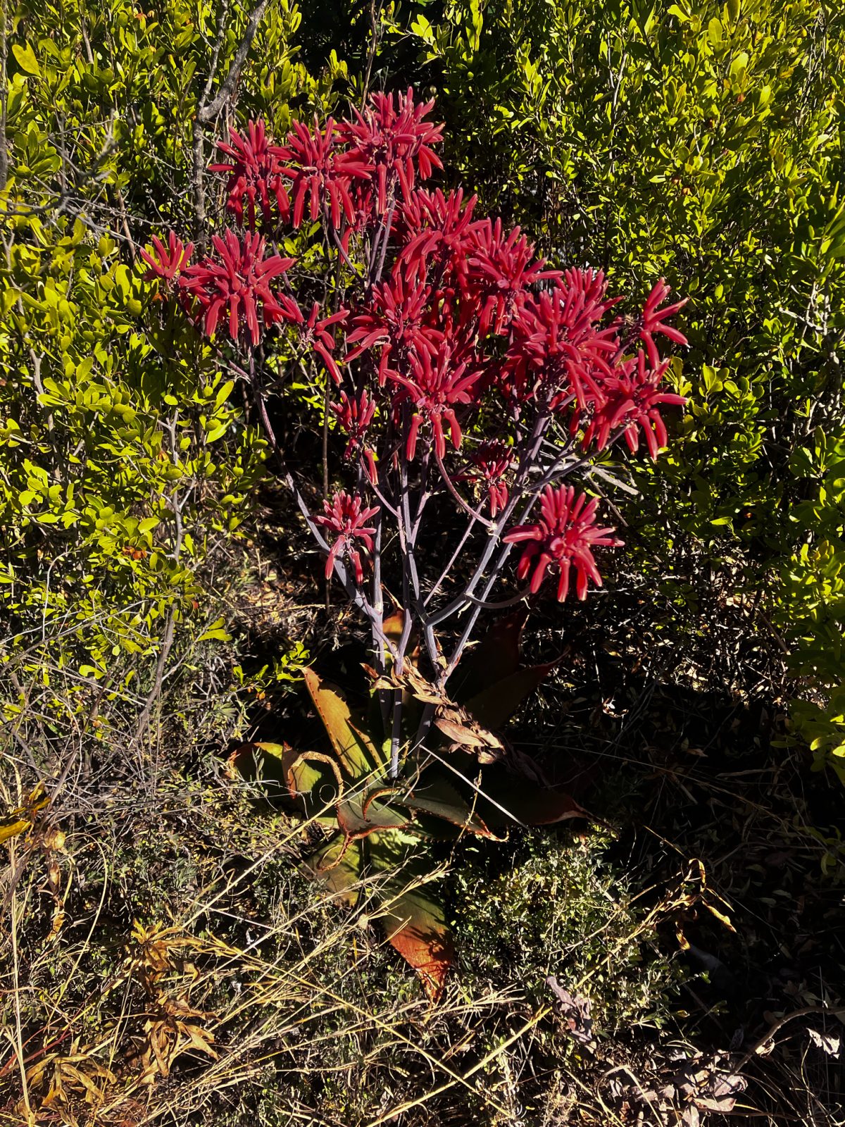 Aloe branddraaiensis通常为无茎或极短茎的丛生植物,形成莲座状叶丛,直径约20-40厘米(8-16英寸)。叶片线性、条纹状,长约30-50厘米(12-20英寸),宽3-5厘米(1.2-2英寸),表面光滑蜡质,绿色具条纹;边缘有小齿。叶片排列成开放莲座。在干旱或强光下呈红色调。花序分支,高50-70厘米,总状花序圆柱形,长约20-30厘米;花朵红色,长约3厘米,管状密集排列。花期主要在南半球冬季(约6-8月)。果实为蒴果,长圆形,长约2厘米,直径1厘米;种子有翅。植株整体生长缓慢,长寿,变异性主要在叶色从绿到红调,取决于环境。