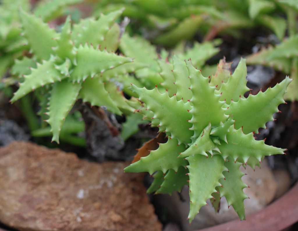 Aloe congolensis通常为小型丛生植物,高15-20厘米(6-8英寸),形成紧凑的莲座状叶丛,直径约12厘米(5英寸)。叶片僵硬、塑料般质感、楔形,略微反曲尖端,长约10-20厘米(4-8英寸),宽4-6厘米(1.6-2.4英寸),表面光滑蜡质,亮绿色;边缘有尖锐齿刺,长约1-2毫米,间隔5-10毫米。叶片排列成开放的莲座状。在干旱或强光下呈红色调。花序从叶丛中心伸出,高约1米,多分枝;总状花序圆柱形,长约20-30厘米;花朵浅绿黄色至浅粉橙色,长约2-3厘米(0.8-1.2英寸),管状密集排列。花期主要在南半球夏季(约12-2月)。果实为蒴果,长圆形,长约2厘米,直径1厘米;种子有翅。植株整体生长缓慢,长寿,变异性主要在叶色从绿到红调,取决于环境。