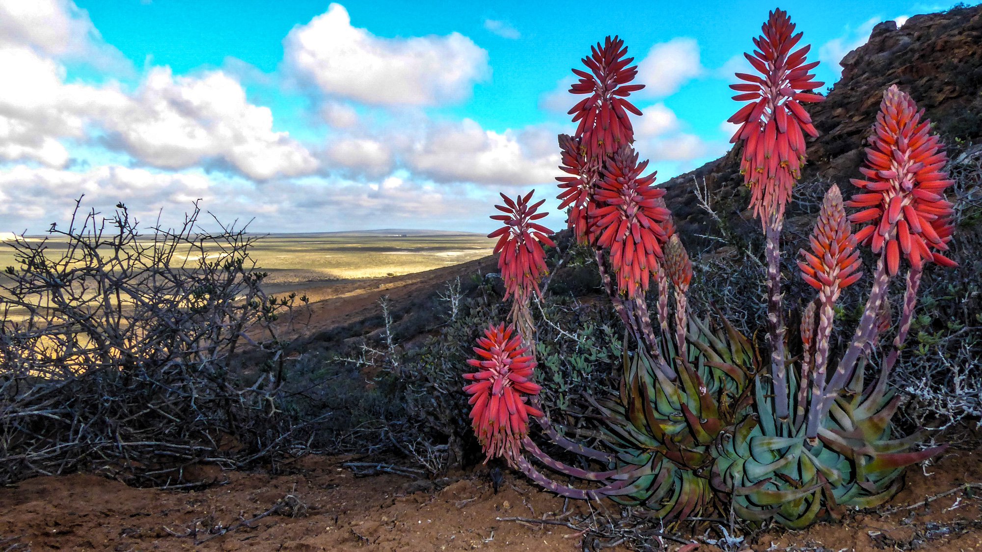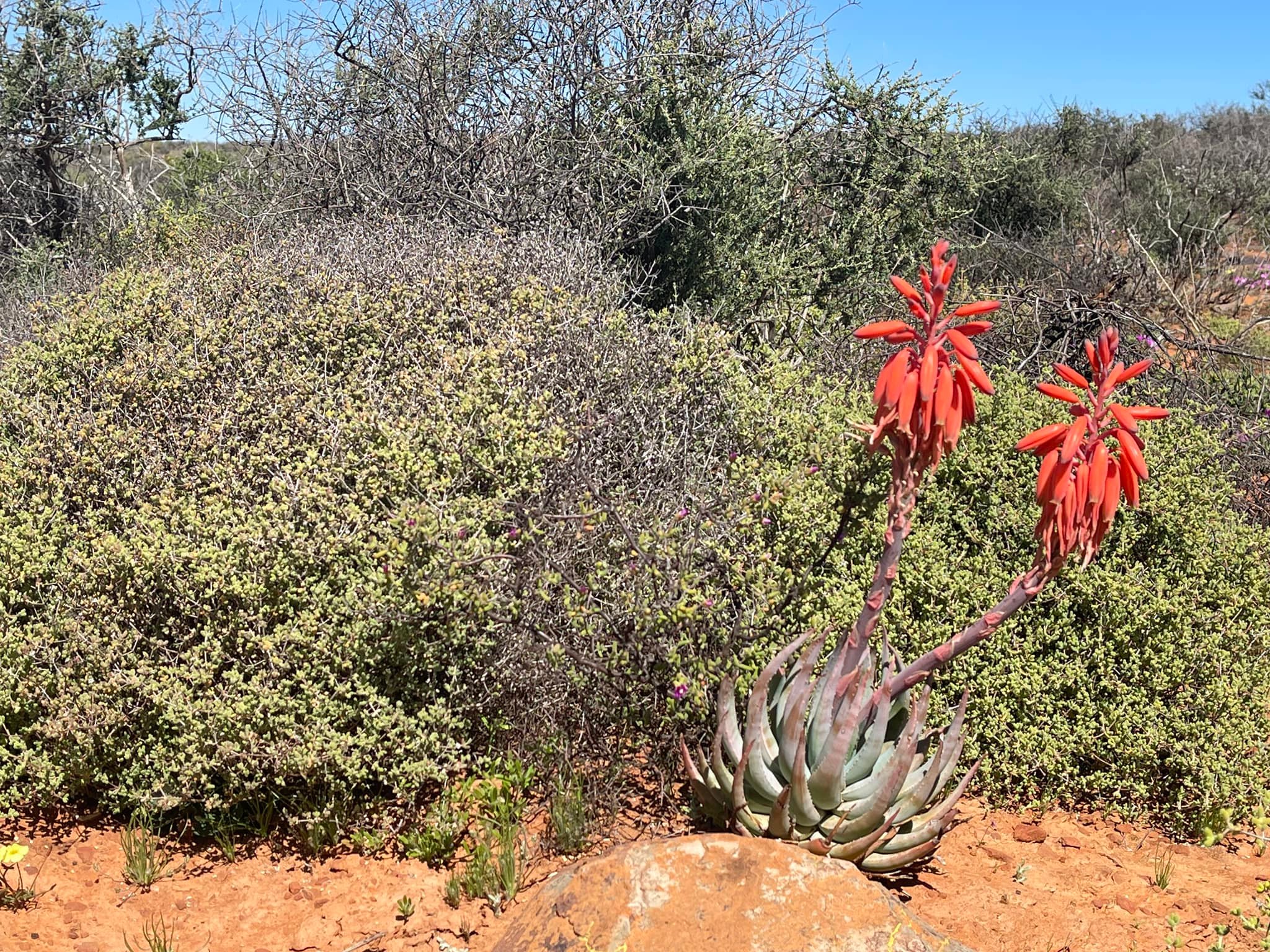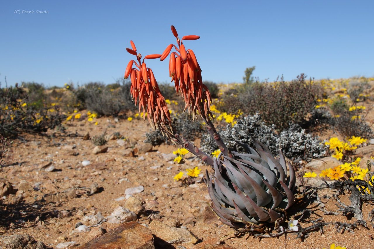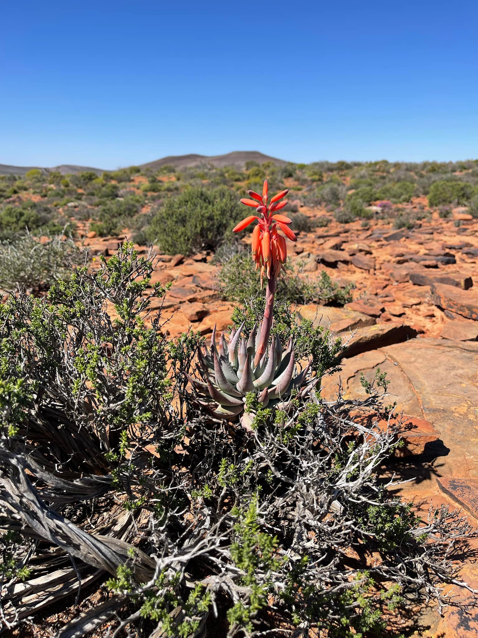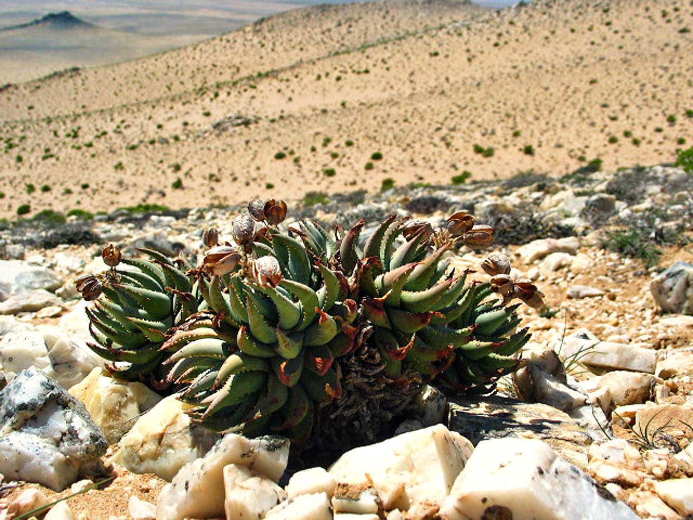 Aloe krapohliana主要分布在南非西北部的冬季雨区,包括Namaqualand和Richtersveld的干燥灌木丛和岩石坡地,海拔约100-500米。该种生长在热而干旱的夏季和低雨量的冬季环境中,常出现在岩石坡面或裂缝上,土壤贫瘠排水良好,年降雨量低,受季风影响,旱季漫长高温。植株常出现在阳光充足的坡面,与其他南非耐旱植物共生,形成小群落。分布范围狭窄,总面积估计不到500平方公里,导致其对干扰敏感。