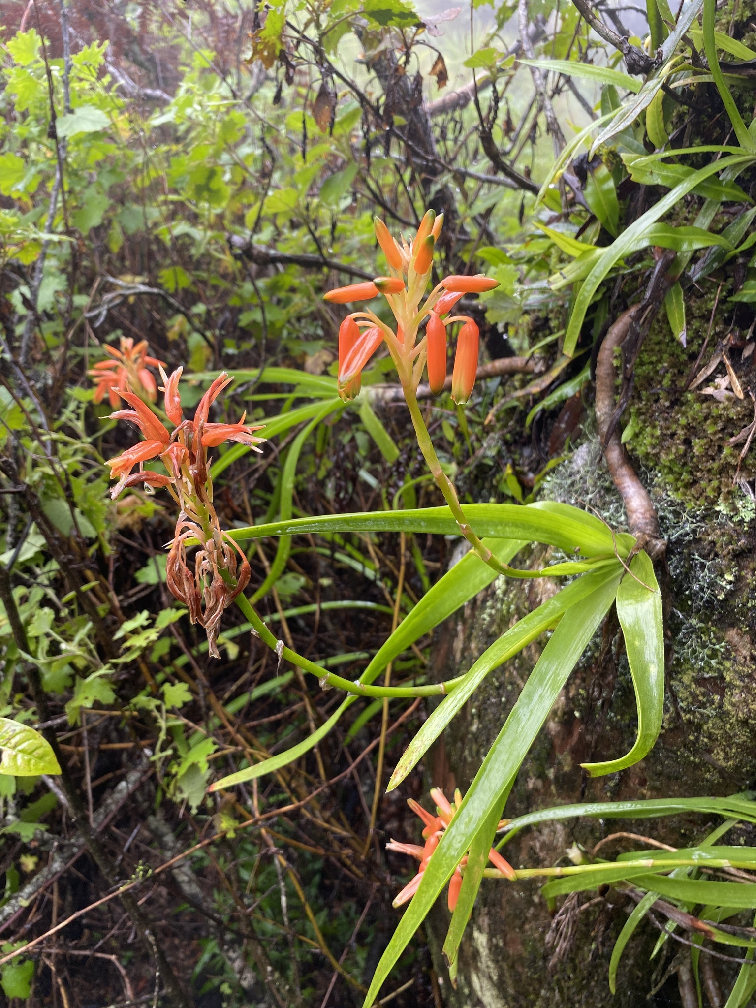 Aloe nubigena通常为低矮丛生植物,从基部繁殖形成小簇,直径约20-40厘米(8-16英寸)。叶片柔软、浅绿色,反曲,长约10-20厘米(4-8英寸),宽4-6厘米(1.6-2.4英寸),表面光滑蜡质,无斑点;边缘有小而尖锐的棕色齿刺,长约1-2毫米,间隔5-10毫米。叶片排列成开放的莲座状。在干旱或强光下呈红色调。花序从叶丛中心伸出,高约30-50厘米,不分枝或少分枝;总状花序圆柱形,长约15-25厘米(6-10英寸);花朵鲜红色,长约2-3厘米(0.8-1.2英寸),管状密集排列。花期主要在南半球冬季(约6-8月)。果实为蒴果,长圆形,长约2厘米,直径1厘米;种子有翅。植株整体生长中等速度,长寿,变异性主要在叶色从浅绿到红调,取决于环境。