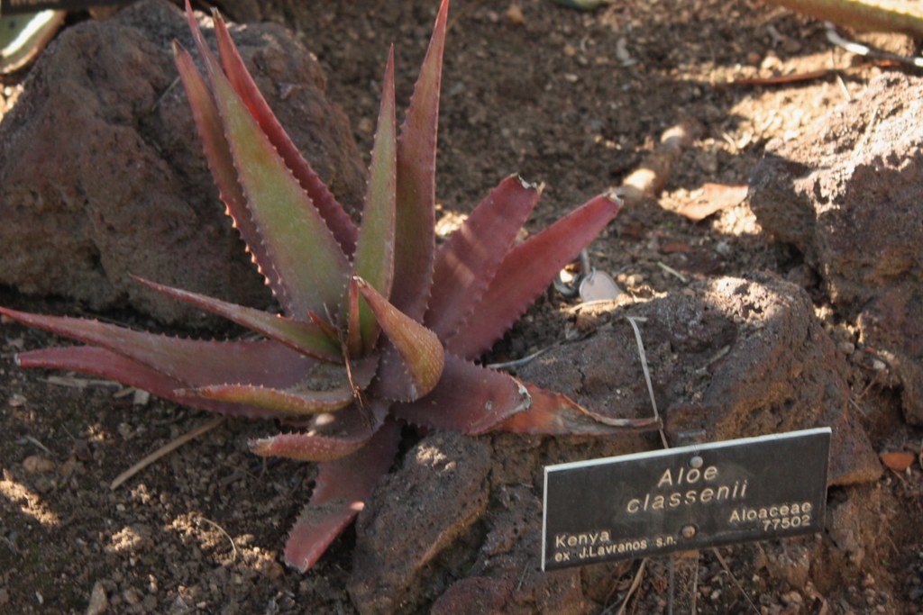 是一种肯尼亚东南部特有芦荟属植物,原产于该国东南部干燥灌木丛中的岩石露头,接近坦桑尼亚边境。它是一种小型、多肉植物,以其爬行茎、吸芽丛生习性和冬季深粉色花序而闻名。该物种于1957年由Gilbert Westacott Reynolds首次描述,种名“classenii”纪念植物学家Classen。作为一种岩生适应植物,它生长在干燥的热带生物群落中,适合作为观赏芦荟栽培,尤其在岩石花园或容器中,但野生种群稀少且易受栖息地破坏影响,已被评估为濒危,需要优先选择人工繁殖来源以支持保护。