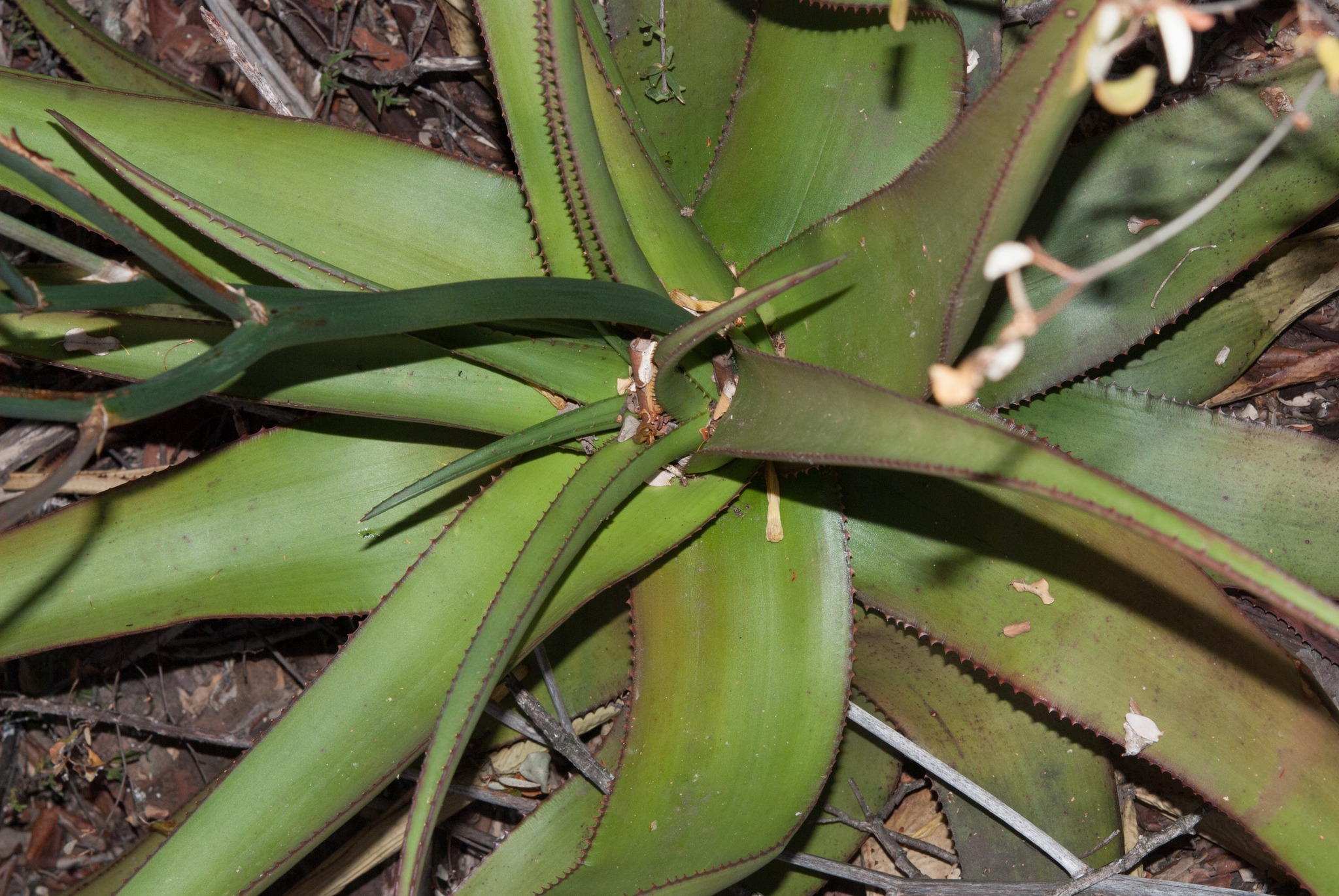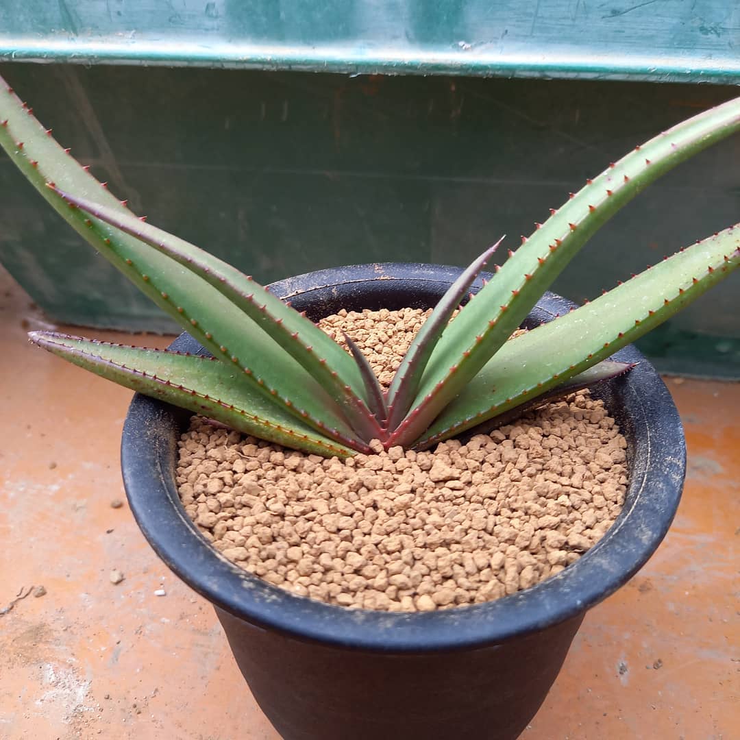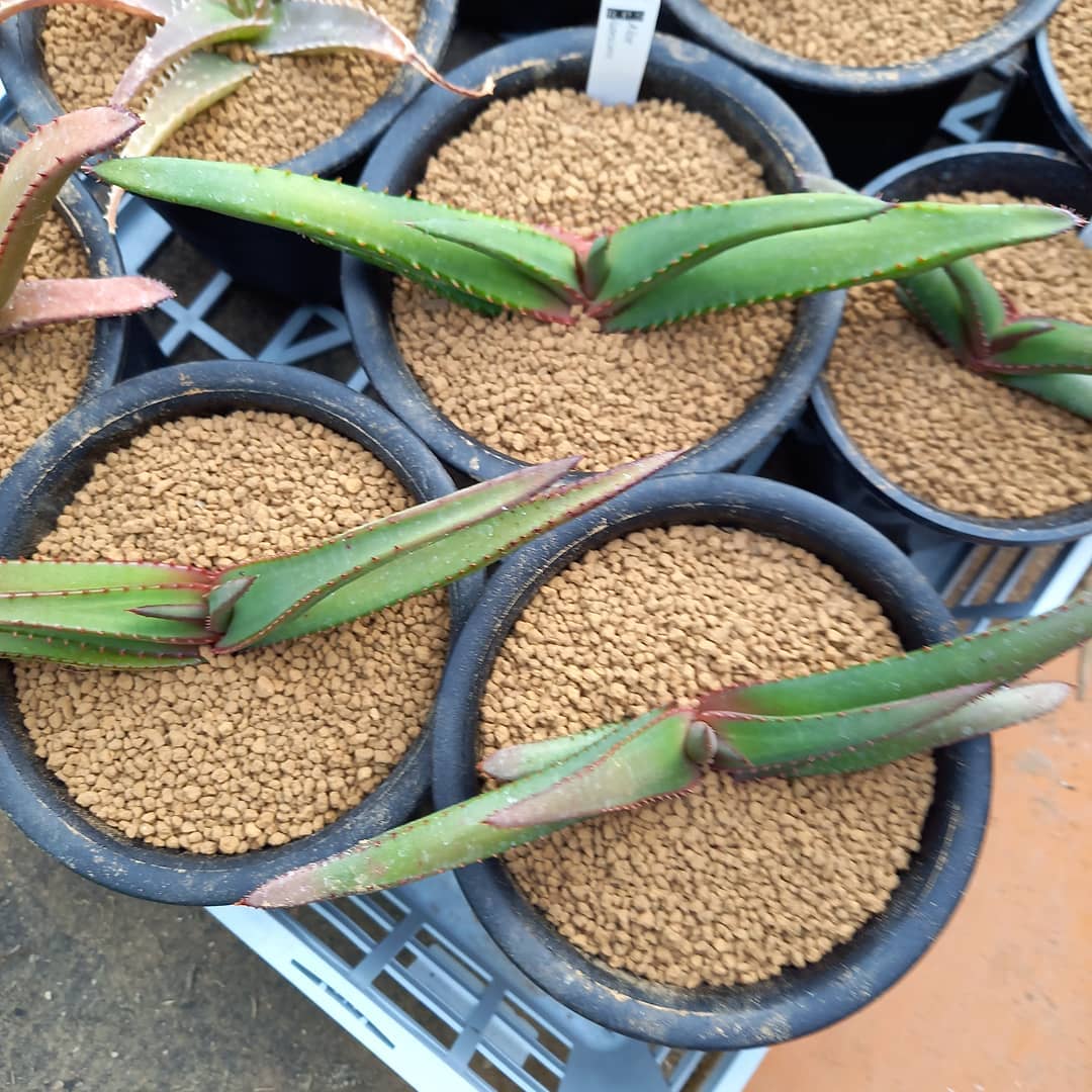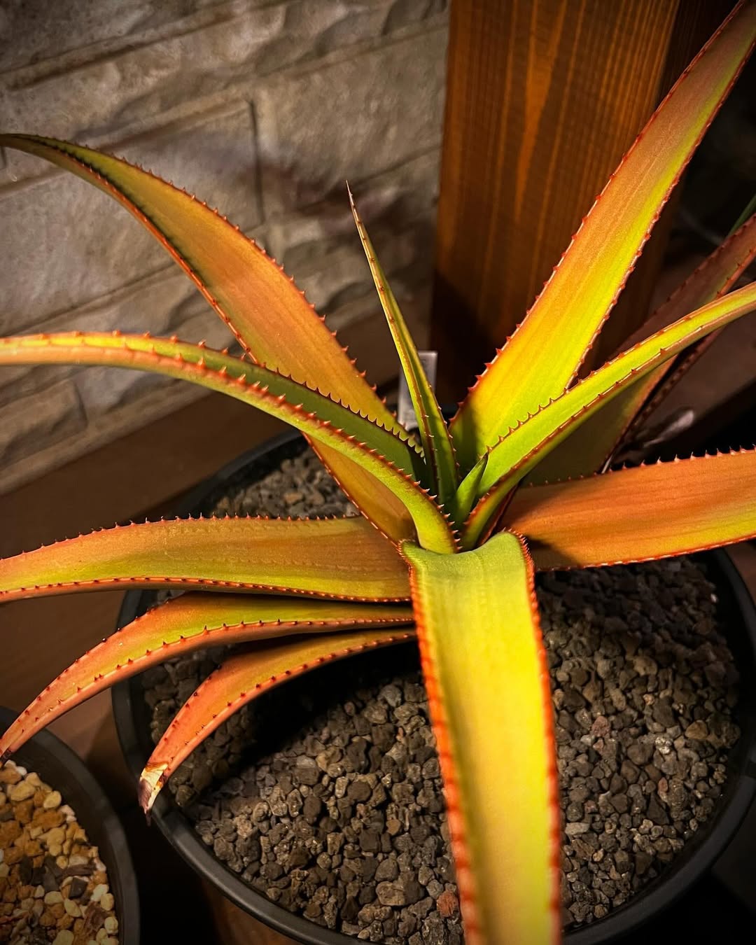Aloe lutescens通常为小型丛生植物,短茎或无茎,形成莲座状叶丛,直径约20-40厘米(8-16英寸)。叶片约10-20片,灰绿色,长约10-20厘米(4-8英寸),宽4-6厘米(1.6-2.4英寸),表面光滑蜡质,无斑点;在干旱或强光下呈红色调;边缘有小而尖锐的棕色齿刺,长约1-2毫米,间隔5-10毫米。叶片排列成开放的莲座状。花序从叶丛中心伸出,高约30-50厘米,不分枝或少分枝;总状花序圆柱形,长约15-25厘米(6-10英寸);花朵橙红色,长约2-3厘米(0.8-1.2英寸),管状密集排列。花期主要在南半球冬季(约6-8月)。果实为蒴果,长圆形,长约2厘米,直径1厘米;种子有翅。植株整体生长缓慢,长寿,变异性主要在叶色从灰绿到红调,取决于环境。