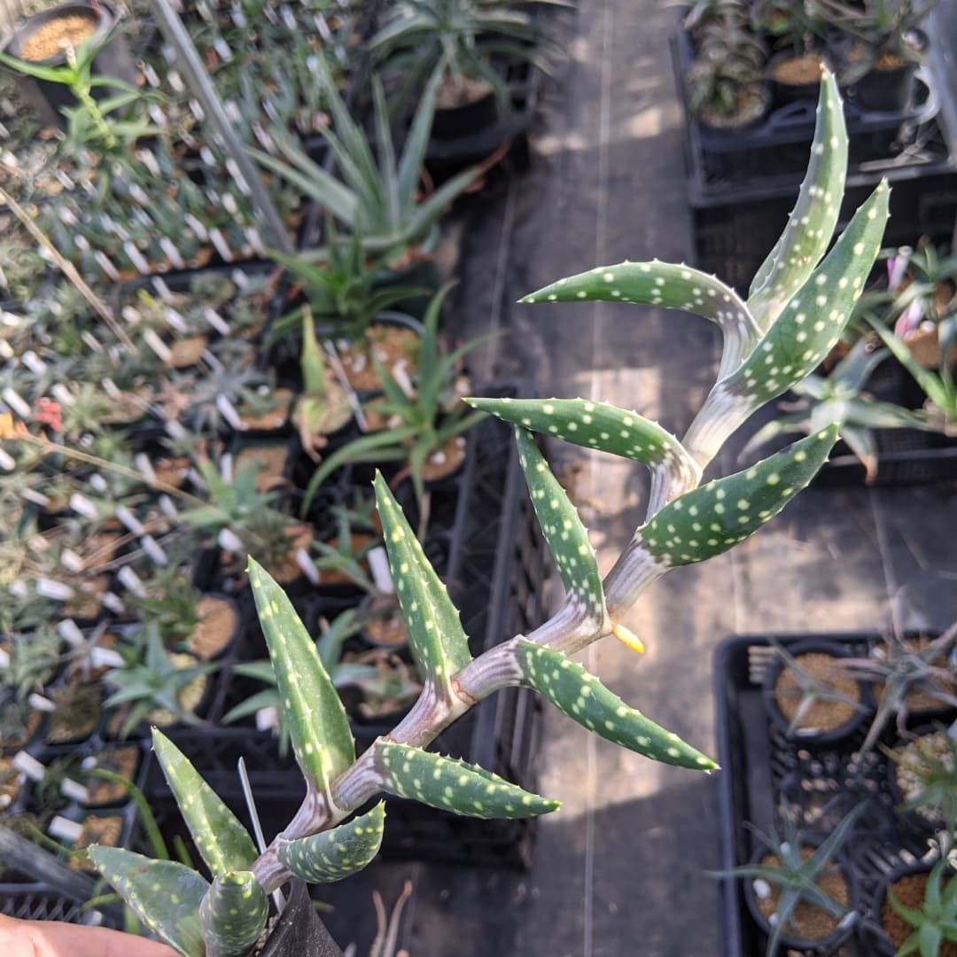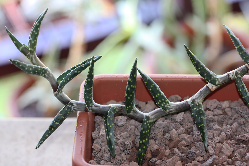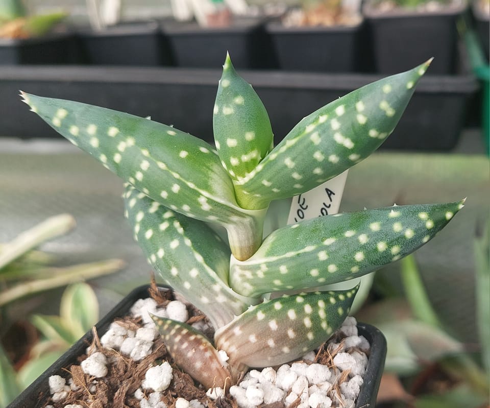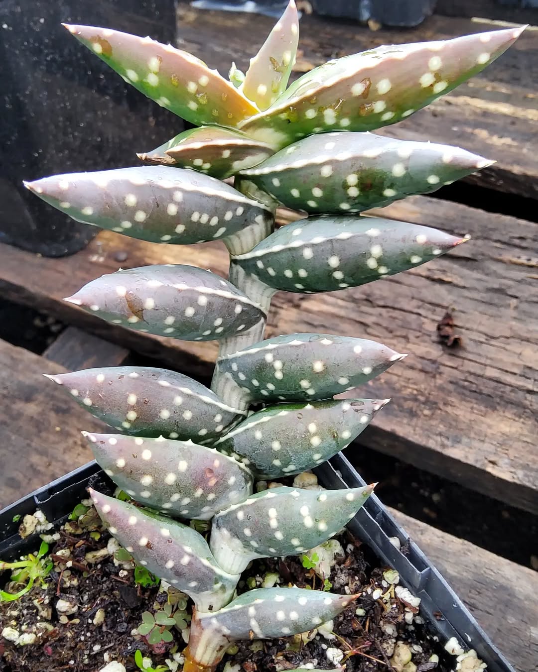 叶片:呈三角形肉质叶,总体色泽为青灰绿带白斑点,斑点不规则分布,是其重要辨识性特征。