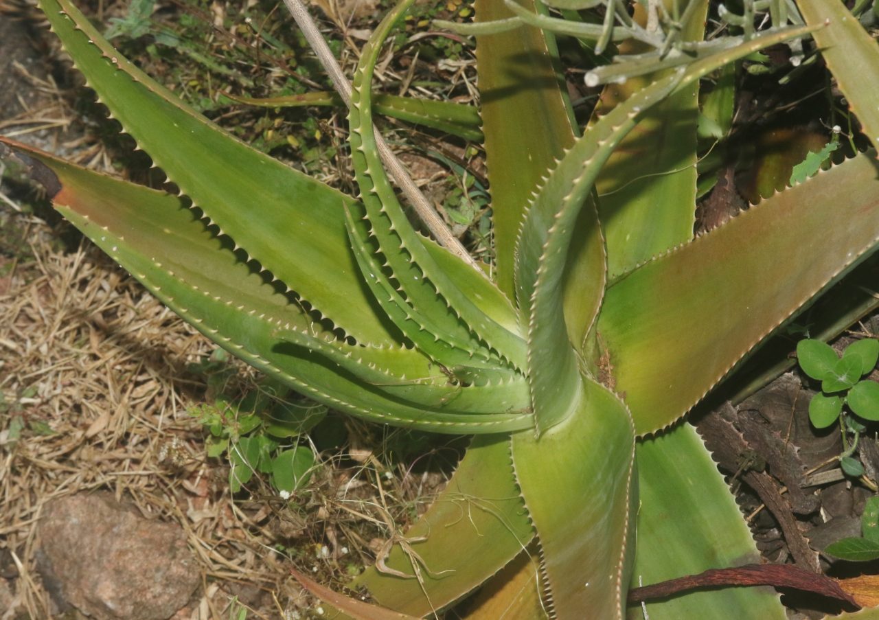 它的叶片为鲜绿色,叶基较宽(可达约 6 cm),向尖端渐细而伸长至 30–45 cm。叶缘布有红色尖齿(约 3 mm 长),齿距约 3 mm,整片叶形刚劲有力。叶汁为黄色,干燥后变为浅黄色。