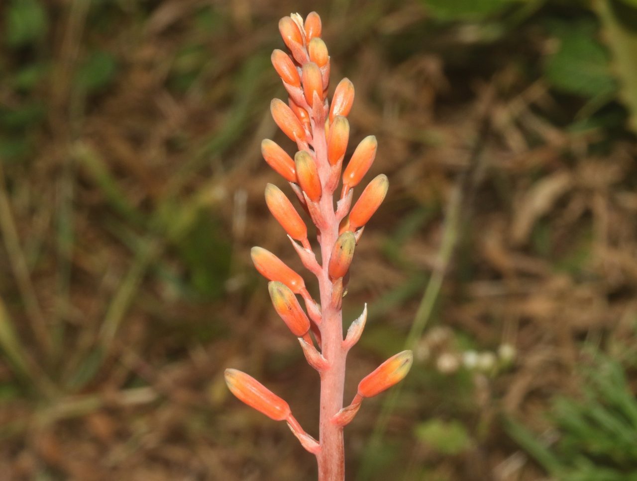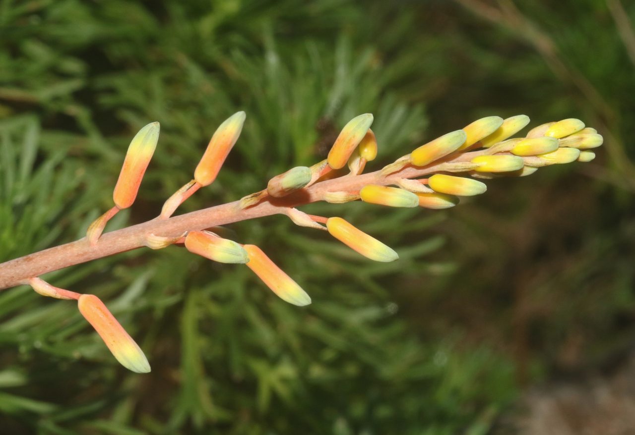 花序通常可长到约 70 cm,呈三至五次分枝的总状花序。苞片呈白色并有五条脉纹,花茎呈棕紫色并带有蜡质覆盖。花朵橘色,基部偏黄,花冠约 25 mm 长。雄蕊与雌蕊略从花冠伸出,展现典型芦荟属的繁殖结构。