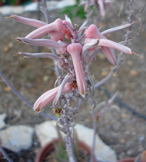 花序由莲座中心抽出,为分枝总状花序,通常高度可达 1.0–1.3 m。花序上观赏性强,花朵粉红色至淡粉色,单花长约 21–30 mm。总状花序的分枝多达 5–7 枝,配以尖形苞片。