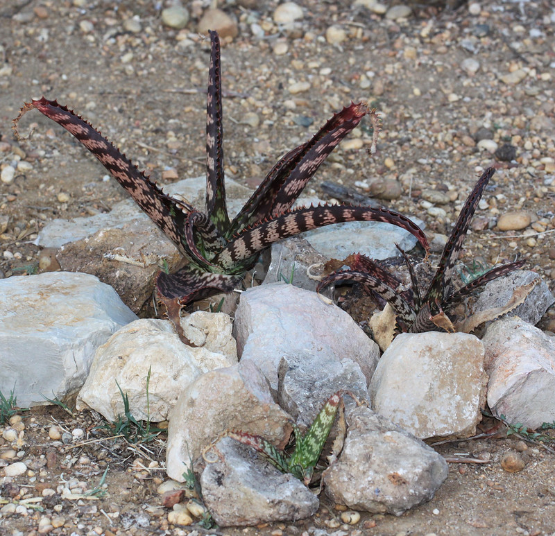 叶缘具粉褐至粉红褐色的锯齿状刺,刺长约 3–4 mm、齿距约 8–10 mm。叶片上半部略向外弯曲,质地厚实。该种具有吸芽扩繁性,可形成大团簇状群体。