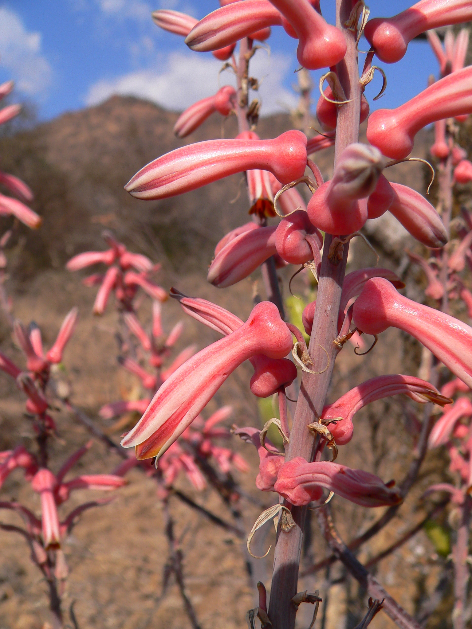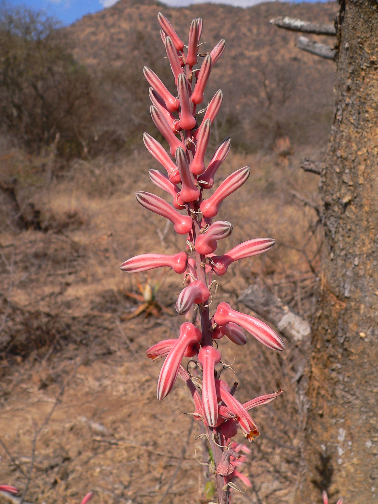 花序自莲座中心直立抽出,可达 0.5–1.5 m,具多分枝的总状/圆锥状花序。花朵多为珊瑚红色或暗红色管状,口部有时带淡色边缘,整体下垂排列,在冬季野外环境(南半球冬季)开花显眼。