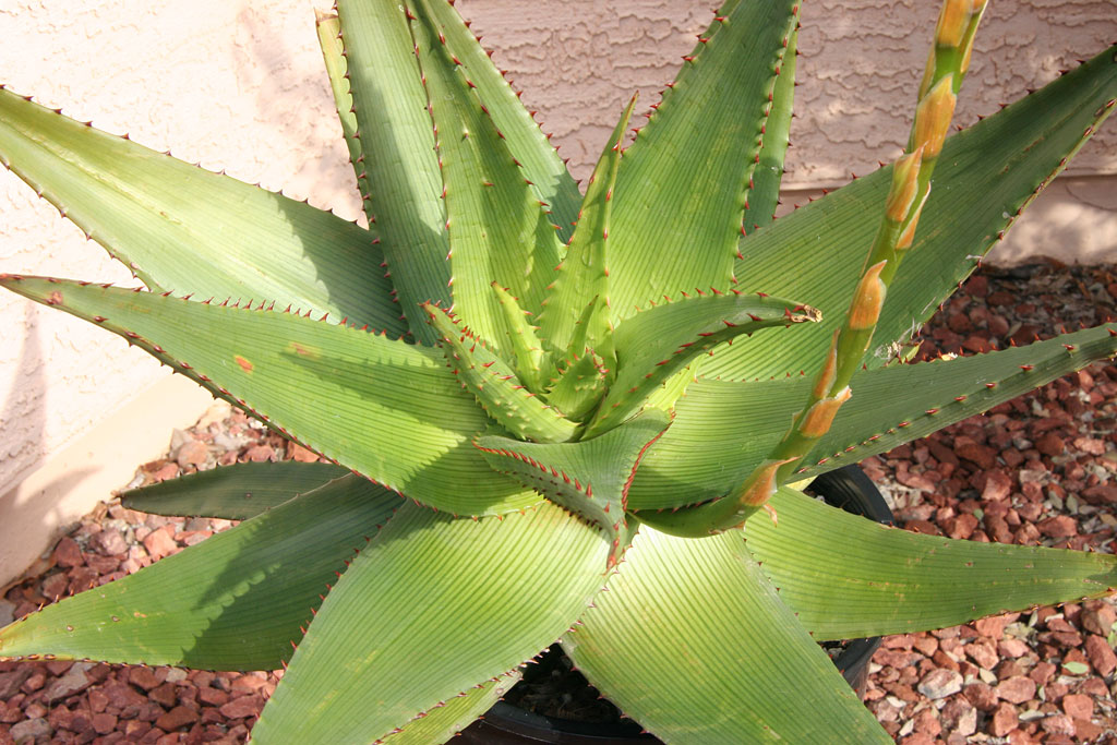 生长缓慢、寿命长、枝叶繁茂的直立灌木,最多可有25个头状花序,呈丛生状,茎高可达1.5米。根部略肉质。枝条上着生干枯的叶片,叶基宿存,形成干燥的叶裙。叶片肉质,革质,顶端莲座状排列,线状披针形,直径600-700毫米,雨季向上展开,旱季或长期干旱时内卷并呈红色,长300-400毫米,宽50-80毫米,有光泽,草绿色,两面均有明显的条纹(条纹半透明,间距3-4毫米);上表面基部圆形,中部扁平,末端略呈沟槽状。下表面圆形,上半部分或三分之一处有明显的龙骨状突起。叶缘和龙骨革质,红褐色,齿长6–7毫米,宽5毫米,深褐色,齿间距10–20毫米,叶端尖锐,末端具1–3个刺。叶汁干燥后呈半透明至淡橙黄色。幼株叶片最初对生(二列),表面呈明显的灰绿色,下表面靠近叶端有少量刺,成熟后变得光滑。
