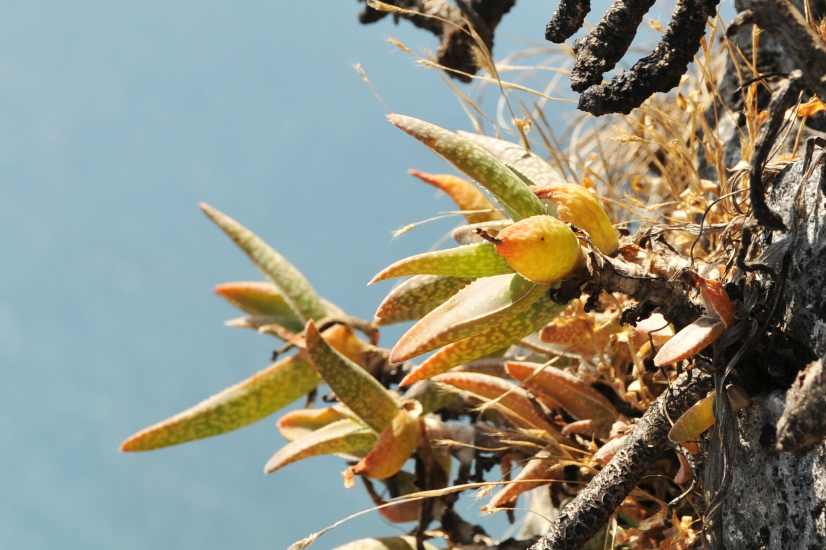 Aloe whitcombei主要分布在阿曼南部的干燥热带地区,包括垂直悬崖顶部(下降约1000米到印度洋),海拔约100-500米。该种生长在季节性干燥的热带生物群落中,常出现在岩石坡面或裂缝上,土壤贫瘠排水良好,受阿拉伯海季风影响,雨季短暂而旱季漫长,温度高,常在20-35°C之间。植株对排水要求极高,避免积水;它常与阿拉伯半岛其他耐旱植物共生,形成局部微生态系统。分布范围狭窄,总面积估计不到500平方公里,导致其对栖息地干扰敏感。
