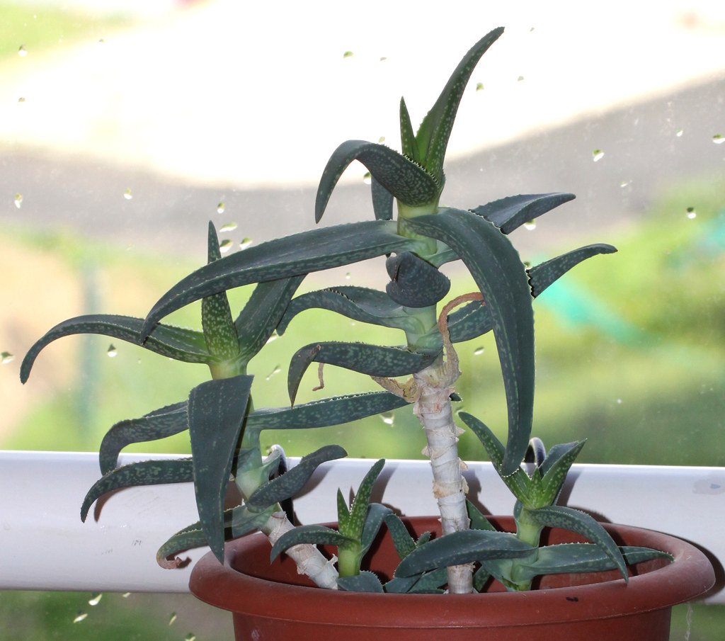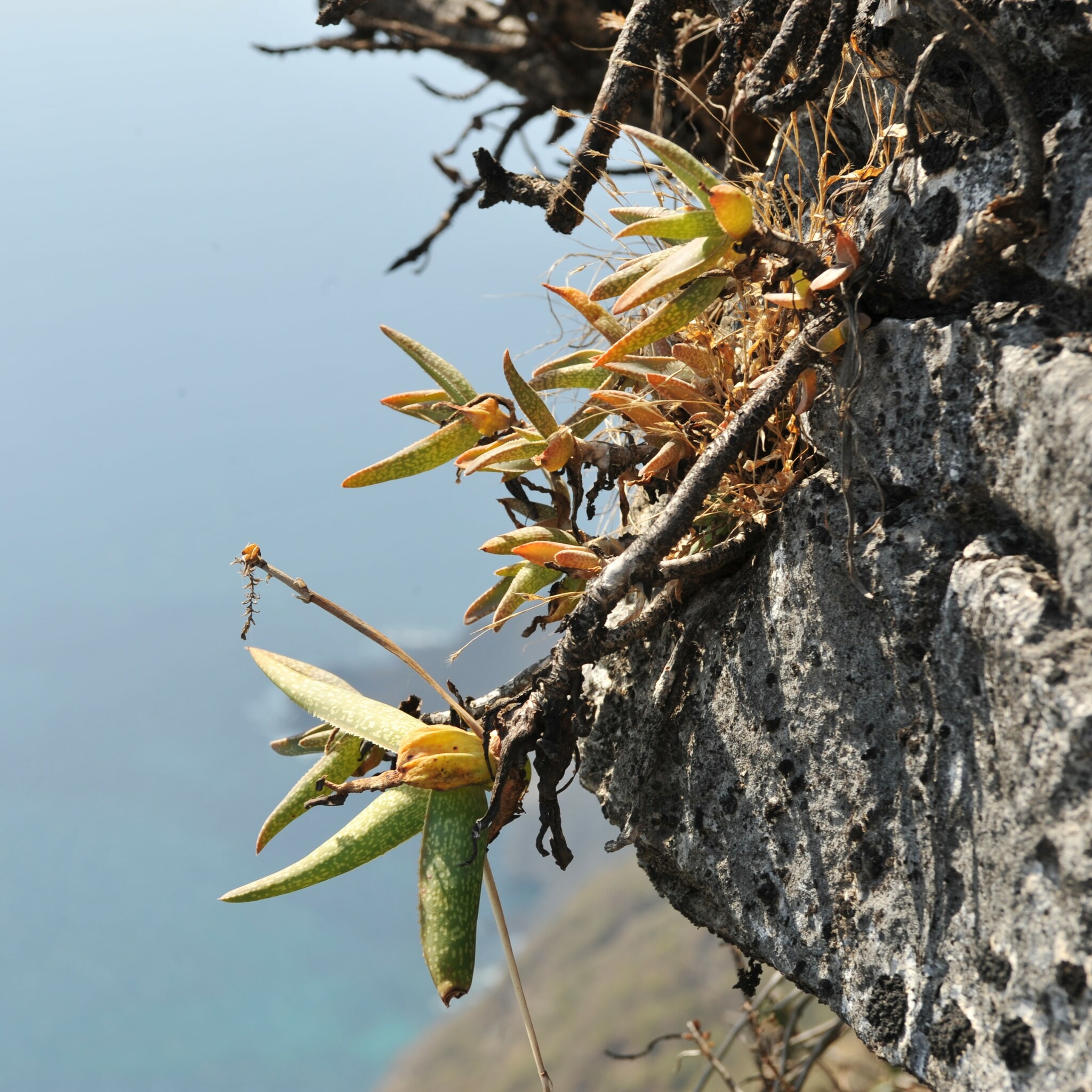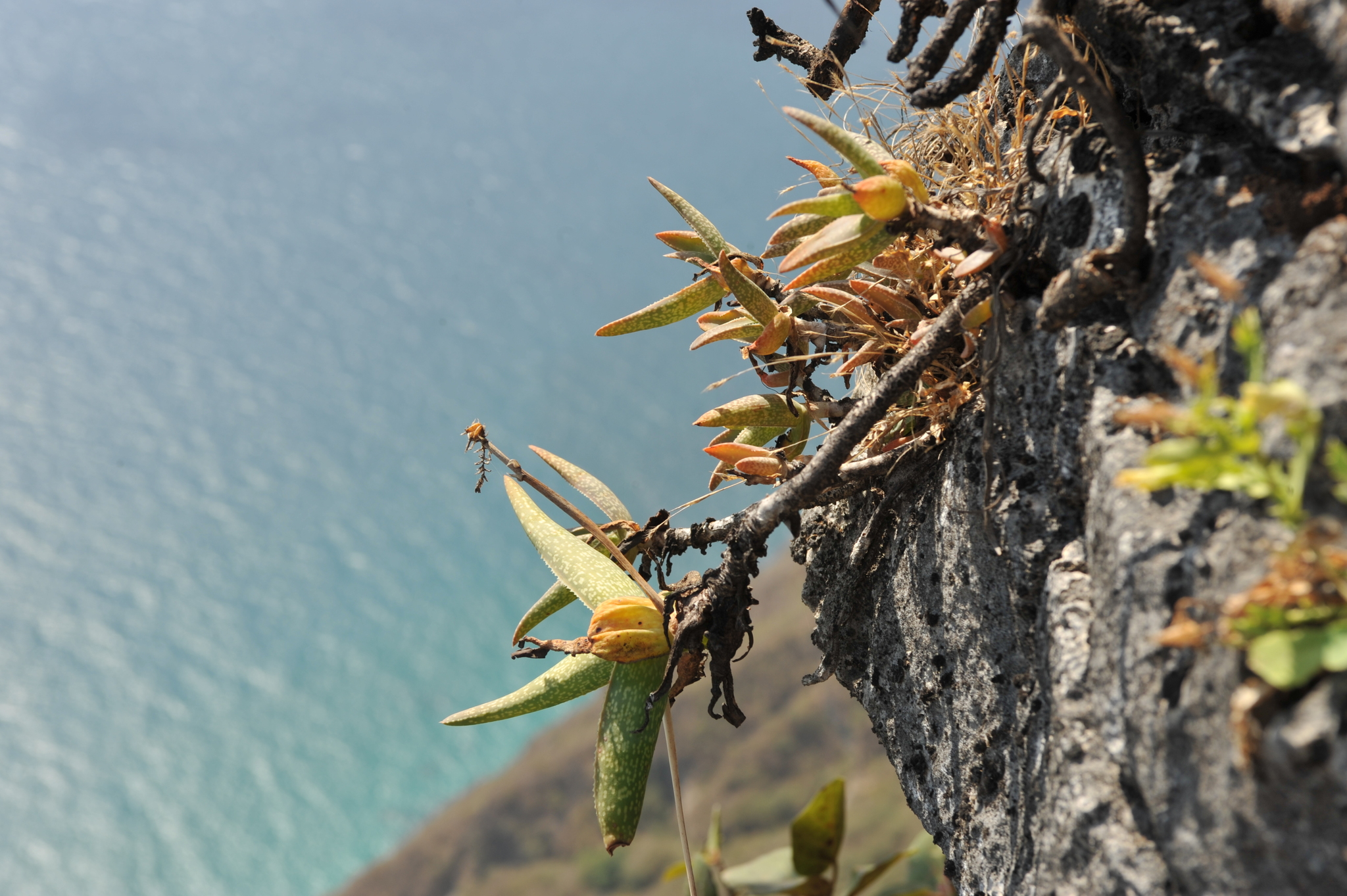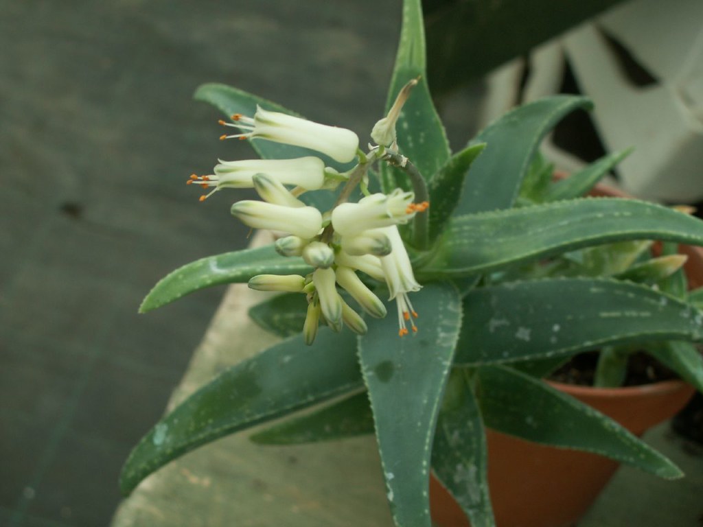是一种极为罕见的芦荟属植物,原产于阿拉伯半岛阿曼沿岸。该物种仅分布于一小段极为狭窄的生境中——几乎垂直的海岸悬崖,这些悬崖直接陡降约1000米(3000英尺),下方即为热带印度洋。尽管地处低纬度地区,其自然生境却很少遭受极端高温侵袭,受海洋影响,当地常年气温温和,并伴随频繁的海雾和湿润空气,形成一种类似“冷凉型沿海悬崖微气候”的特殊环境。这种条件在芦荟属中相当少见。该物种是阿拉伯地区唯一已知开白色花的芦荟,在系统学和区域植物学上具有重要意义。该物种于1995年由John Jacob Lavranos首次描述,发表在《Cactus and Succulent Journal》(Los Angeles)67: 31。作为一种岩生适应植物,它生长在季节性干燥的热带生物群落中,常出现在岩石坡面或裂缝上,适合作为观赏芦荟栽培,尤其在岩石花园或容器中,但野生种群易受栖息地破坏影响,已被评估为易危,需要优先选择人工繁殖来源以支持保护