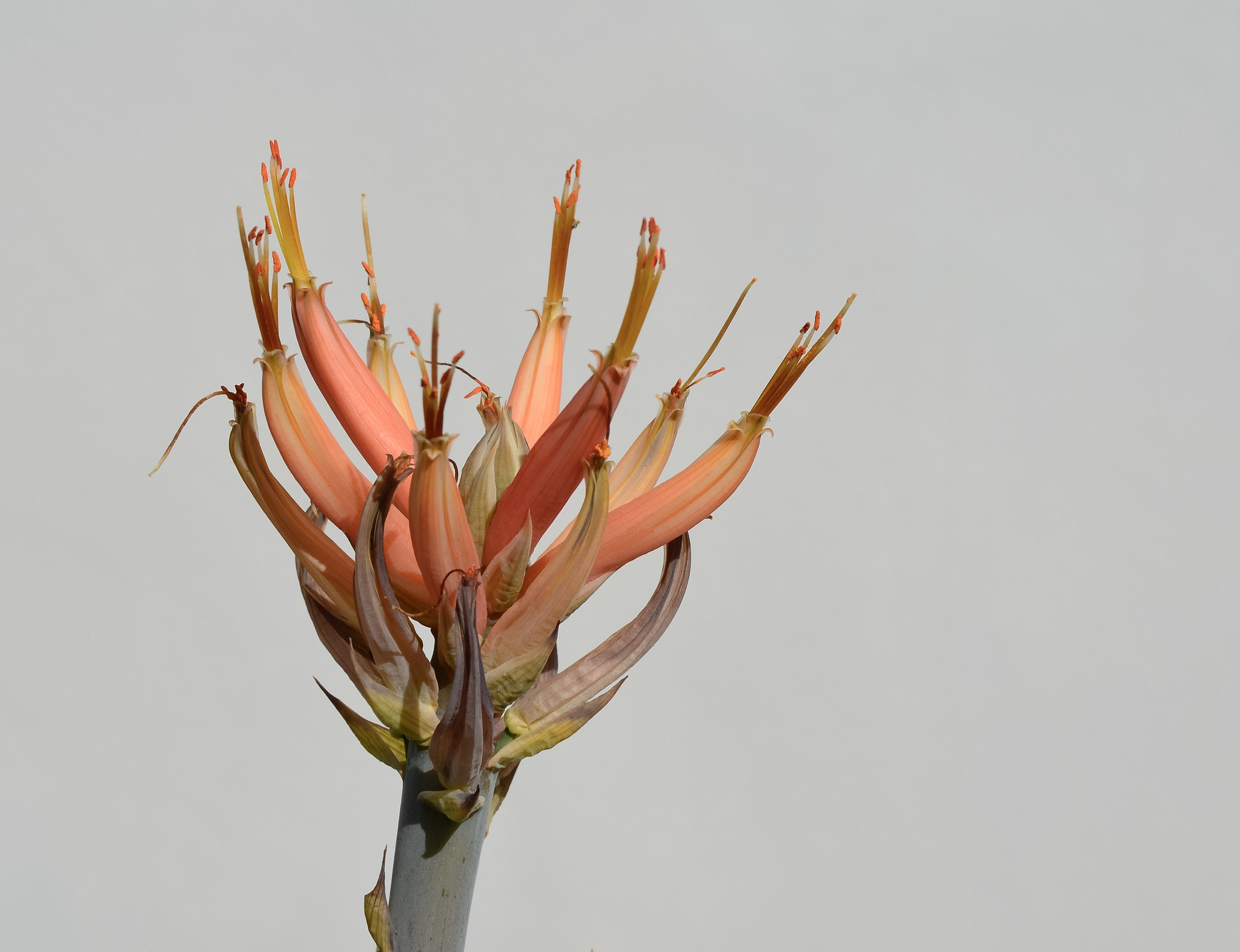 它最显眼的特征是在冬季(南半球约 6–8 月)开花时——中心抽出约 15–25 cm 高的直立花茎,顶端呈密集的圆锥花序,携带约 40–50 朵 鲑粉至珊瑚红的管状花。花朵通常较植株体型大,雄蕊和柱头(styles)明显突出于花冠之外,柱头尤其长,是本种命名的直接依据。