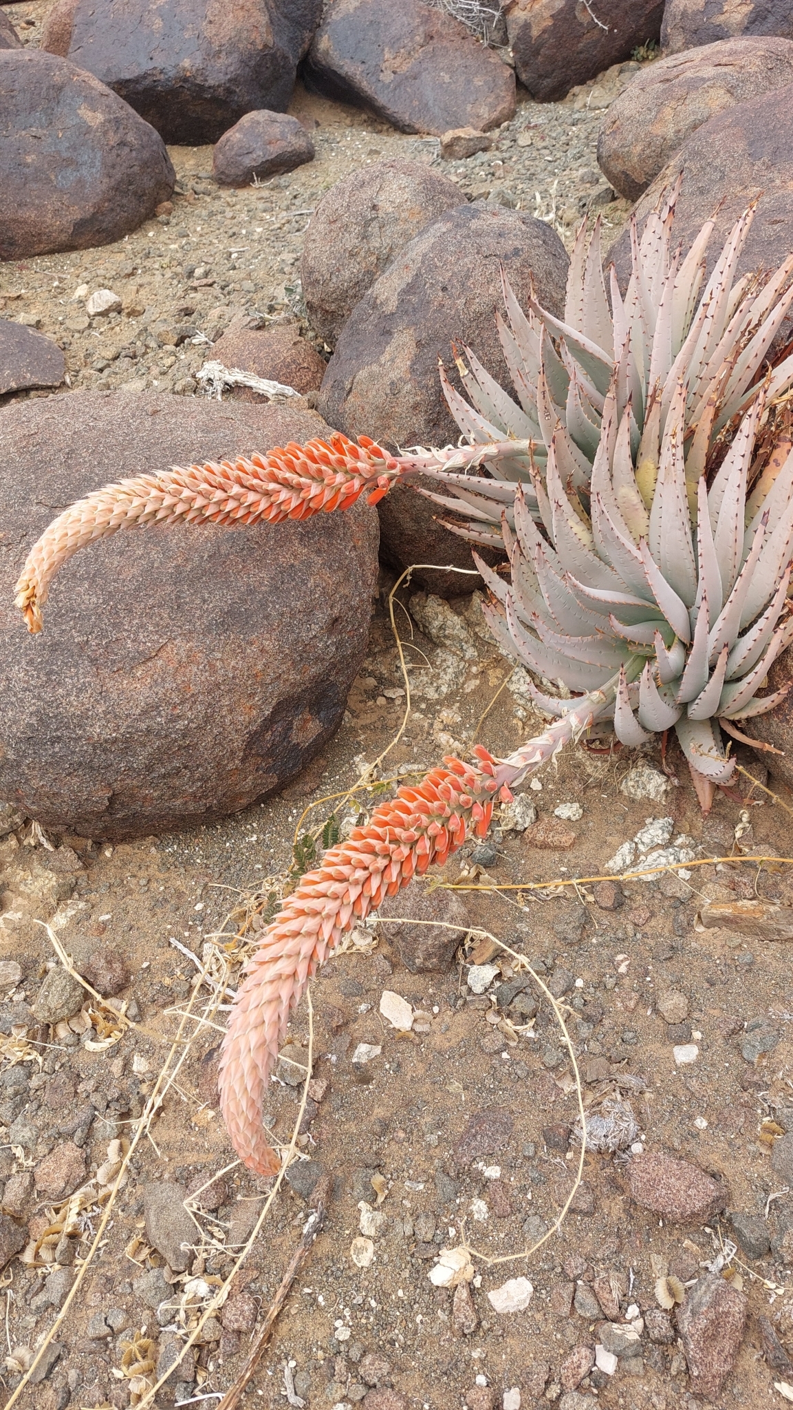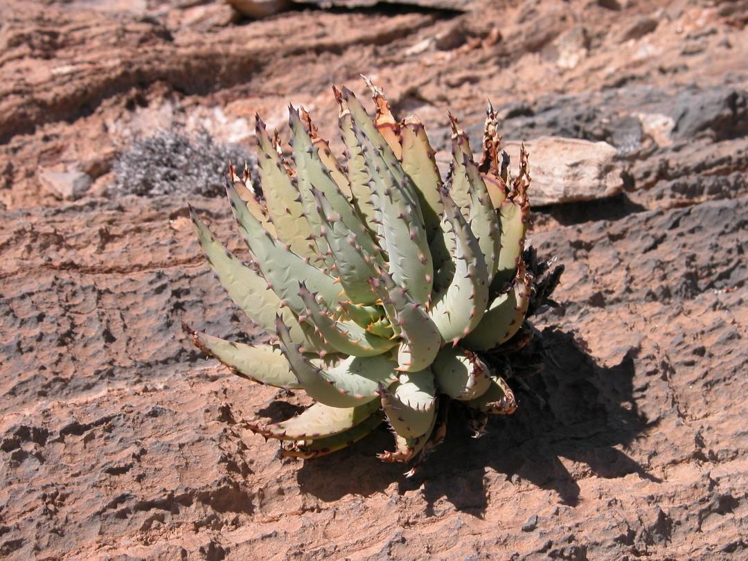 Aloe pachygaster 是一种原生于纳米比亚干旱地区的耐旱多肉植物,属于天门冬科(Asphodelaceae)芦荟属。其种名 pachygaster 源自希腊语 pachys(意为“厚”)与 gaster(意为“腹”),指其花部或茎基的饱满形态。这种芦荟以肉质厚重的莲座叶片、强耐旱与在冬季开花的鲜艳花序闻名,是极端干旱环境中适应力极强的代表种之一。它的坚毅形态和鲜明花色使其在耐旱园艺和干旱景观设计中充满魅力。(Aloe pachygaster 首次由德国植物学家 Moritz Kurt Dinter 于1924年在 Repertorium Specierum Novarum Regni Vegetabilis 中正式发表描述。)