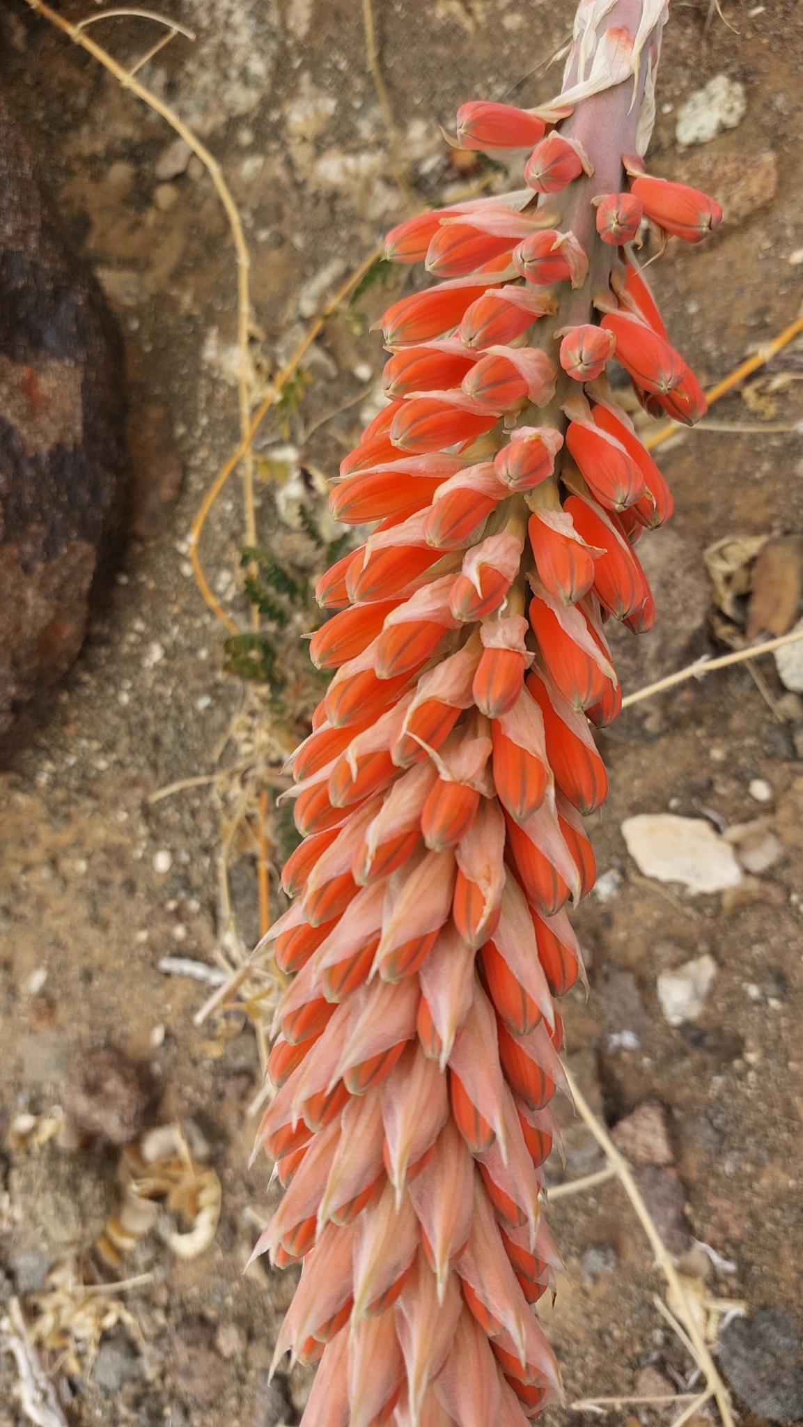 该物种最引人注目的是其花序:冬季(南半球夏末至冬季)开花时,会从莲座中心抽出直立且较高的花茎,顶端集中开出珊瑚红或粉红色、带绿色花冠尖的管状花朵。这些花色鲜艳的花朵不仅吸引传粉昆虫,也在荒漠环境中形成视觉焦点。