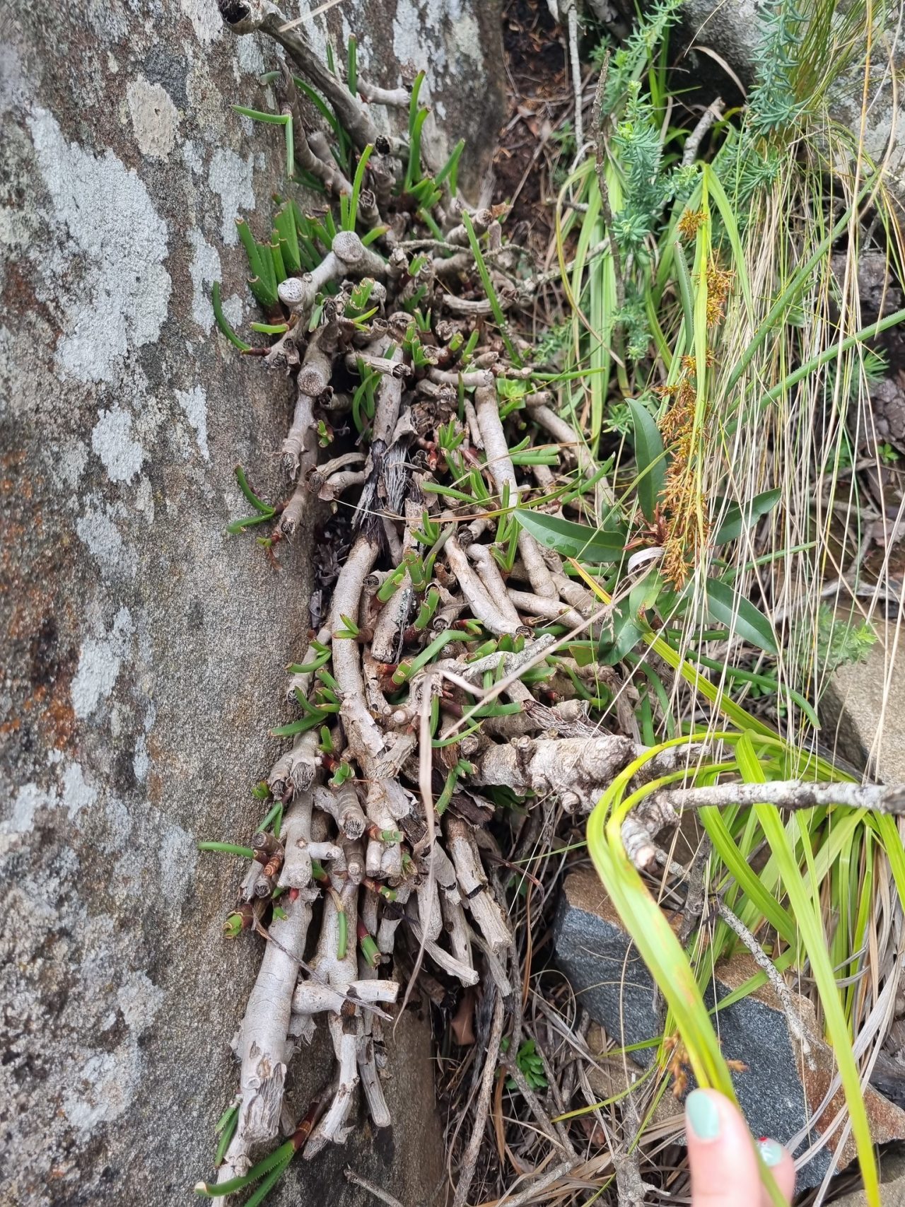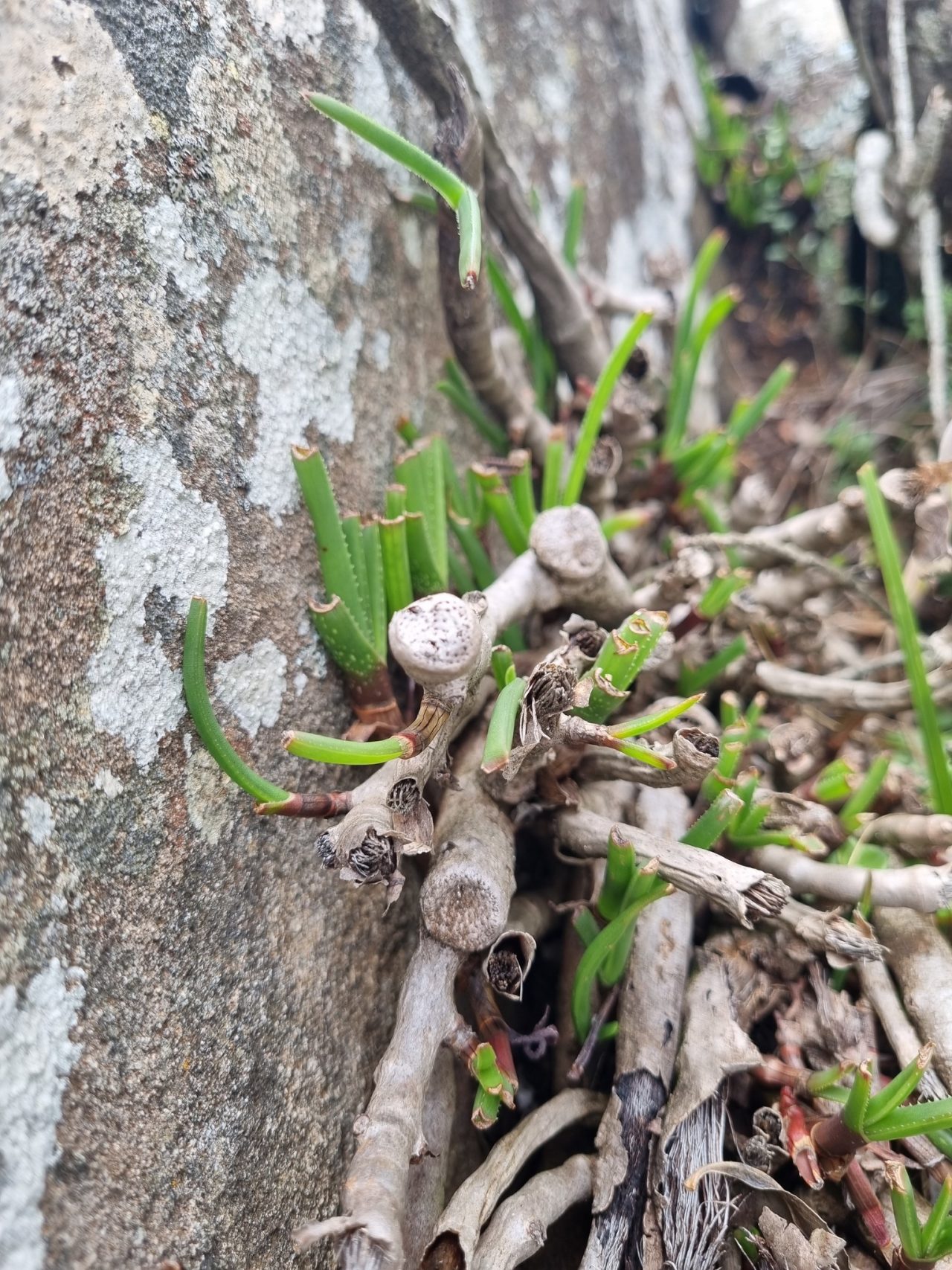 Aloe inyangensis 是一种小型草本或矮灌木状芦荟,通常形成松散的莲座状丛生群体,高度约 20–30 cm。与许多典型的荒漠芦荟不同,其叶片较薄、柔韧、条带状,往往沿中脉向前弯曲,显现出近似“草叶”般的形态。在自然条件下,叶缘具非常细小的齿刺且不明显,整体观感更为柔和。