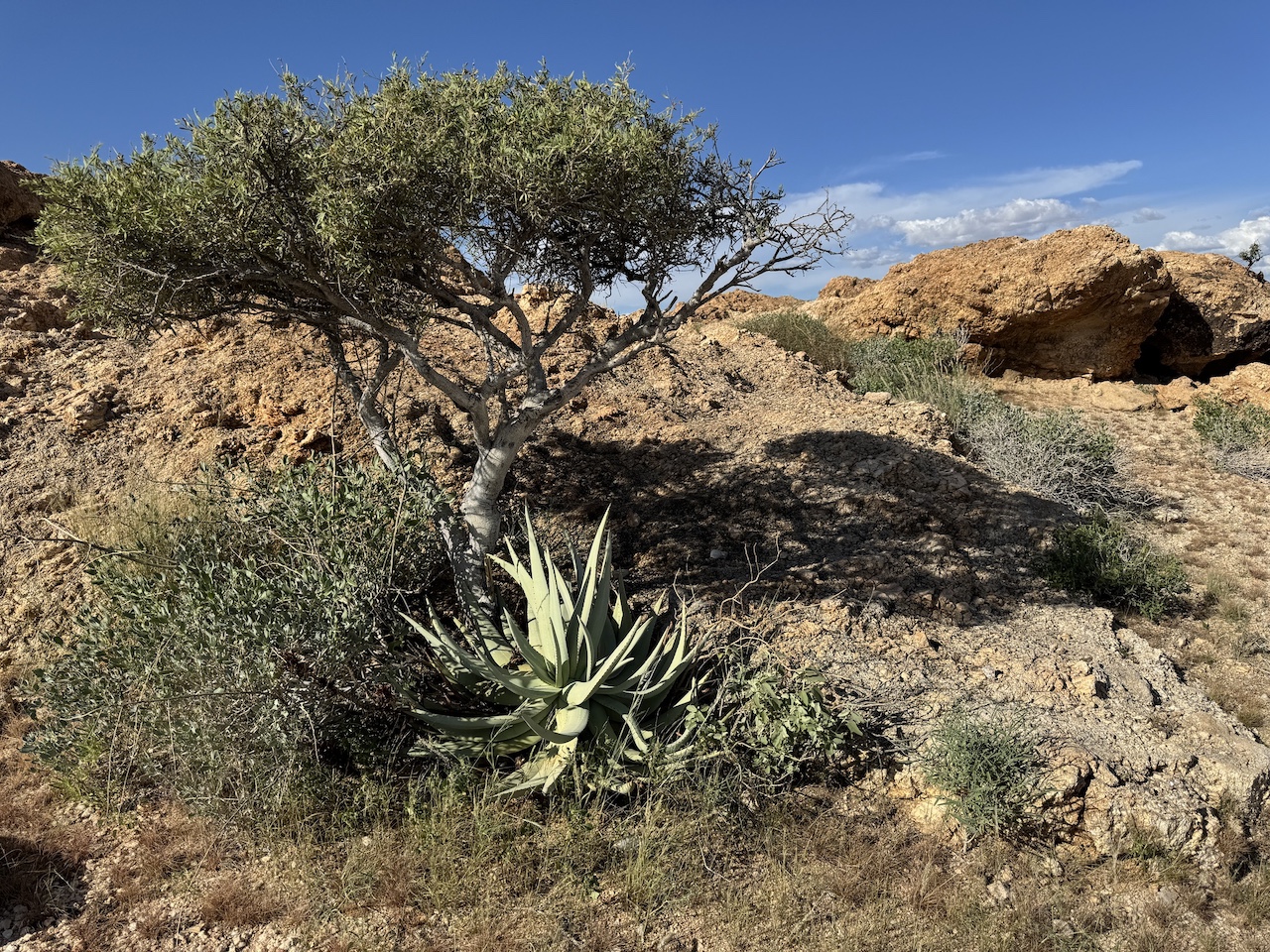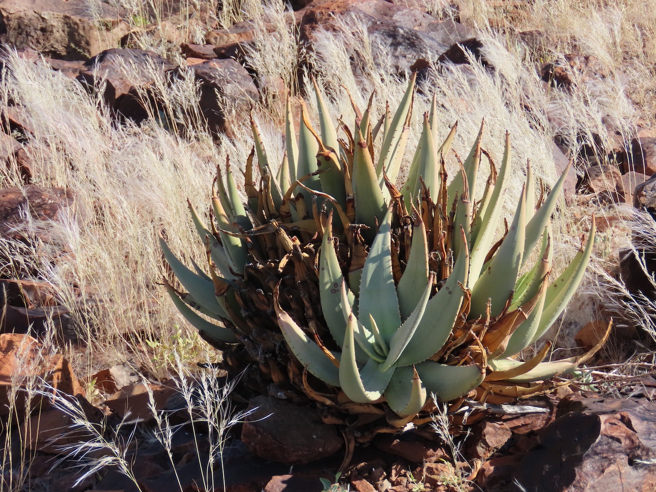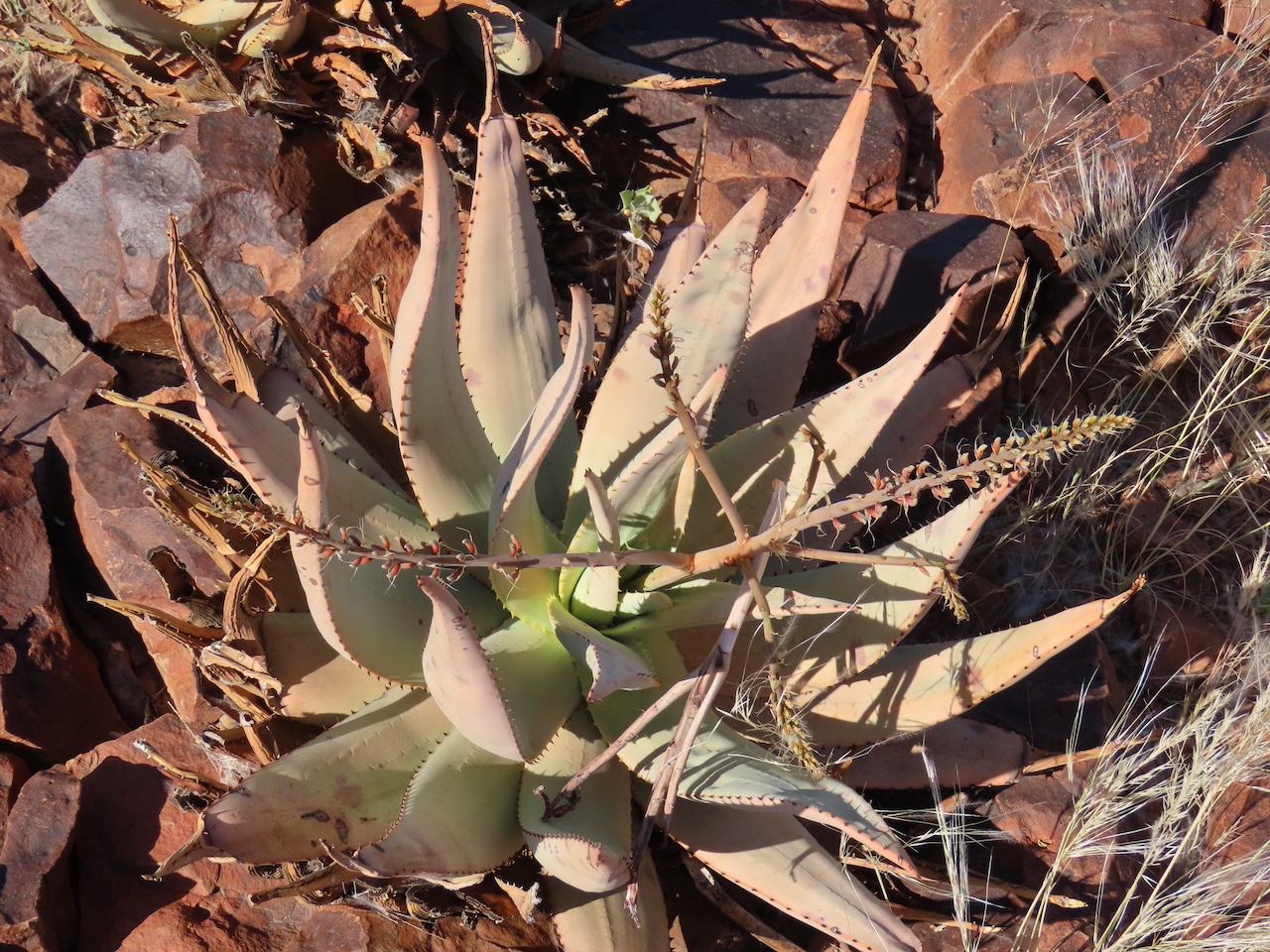 Aloe namibensis 生长于岩石缝隙或开阔砾石地带,属典型耐旱荒漠物种。其厚叶能储存水分,应对沙漠高蒸发率环境;直立花序可吸引稀有荒漠传粉者如蜜蜂与鸟类。在自然环境中,它是岩石植被带耐旱植物群落的重要组成。𑁋野外植株多为单独个体而非密集群落,反映其栖息地微生态的稀疏植被特征。