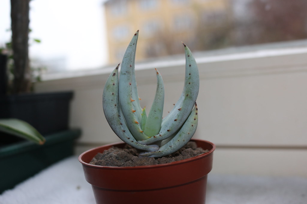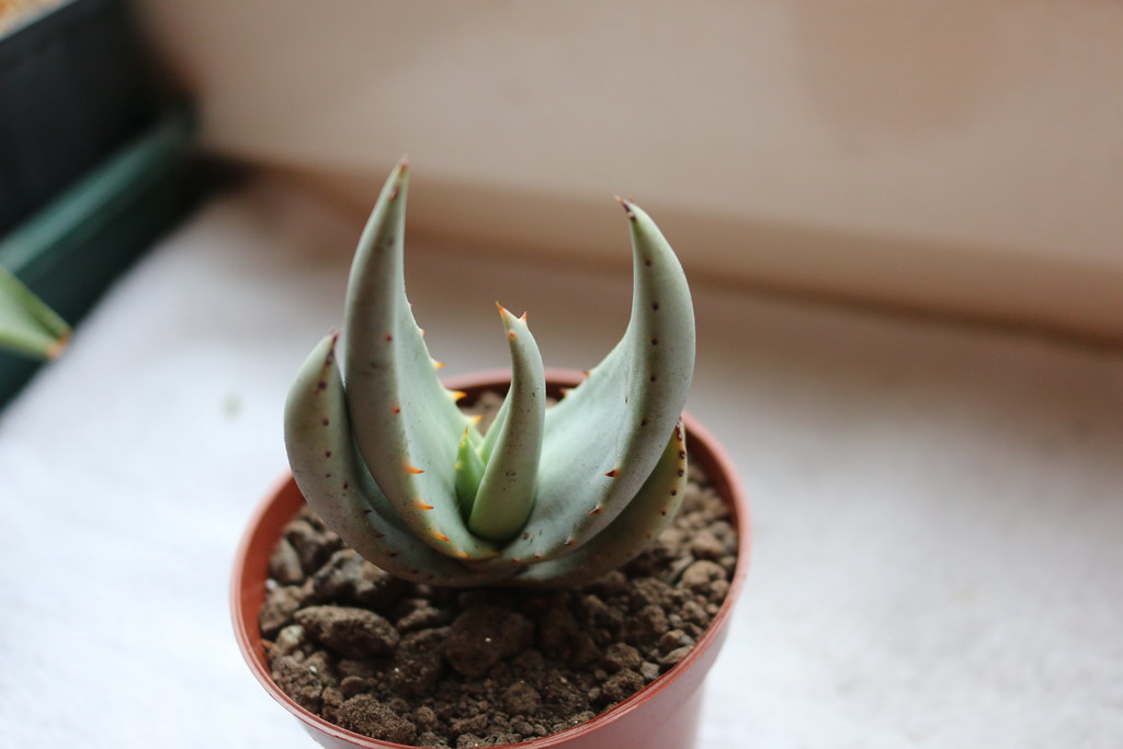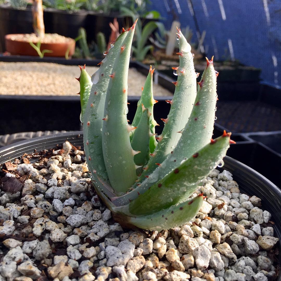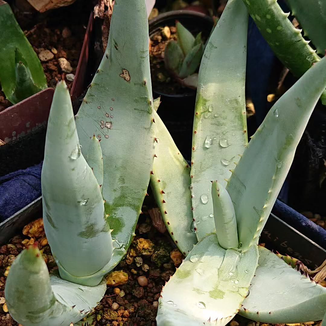 叶片:叶色为灰绿色或浅绿带粉霜质感,在湿润过后亦可偏灰绿。叶片坚硬、向上弯曲,边缘具小而稀疏的黑褐色齿刺。
