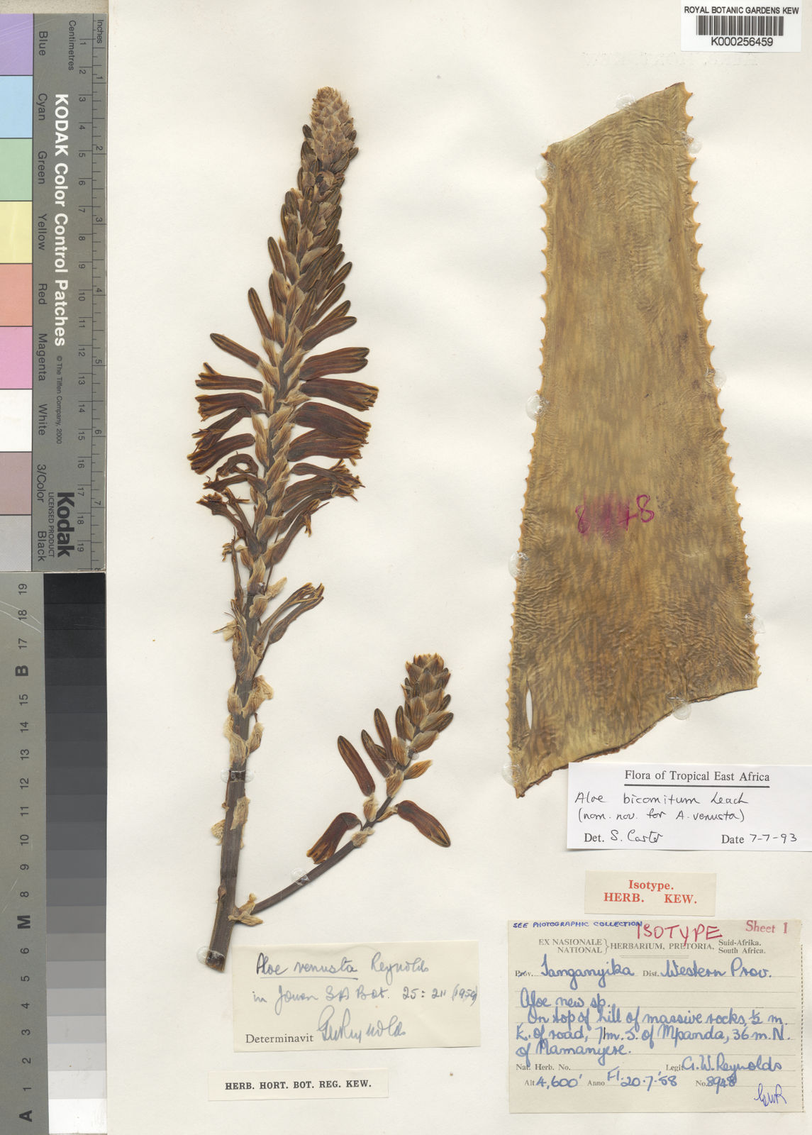 Aloe bicomitum 是一种东非原生的耐旱多肉植物,属于芦荟属(Aloe)和天门冬科(Asphodelaceae)。它由植物学家 Leslie Charles Leach 于 1977 年描述发表,并在多个权威植物资源中被收录为有效学名。其种加词 bicomitum 来自拉丁词根,意为“双伴随”,是为了纪念早期植物学探索者的合作精神。(Aloe bicomitum 是坦桑尼亚与赞比亚等东非地区耐旱生态系统的一部分)。