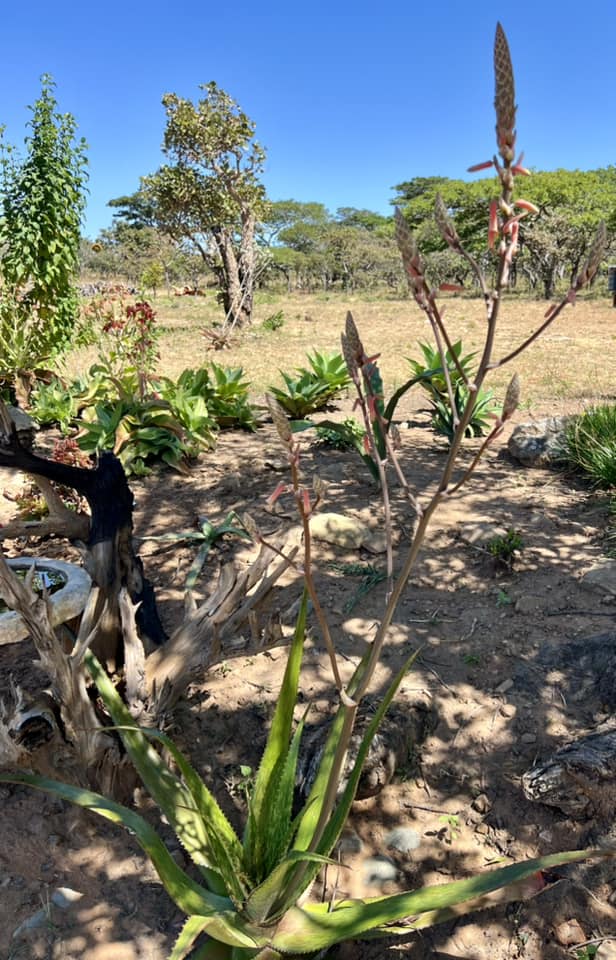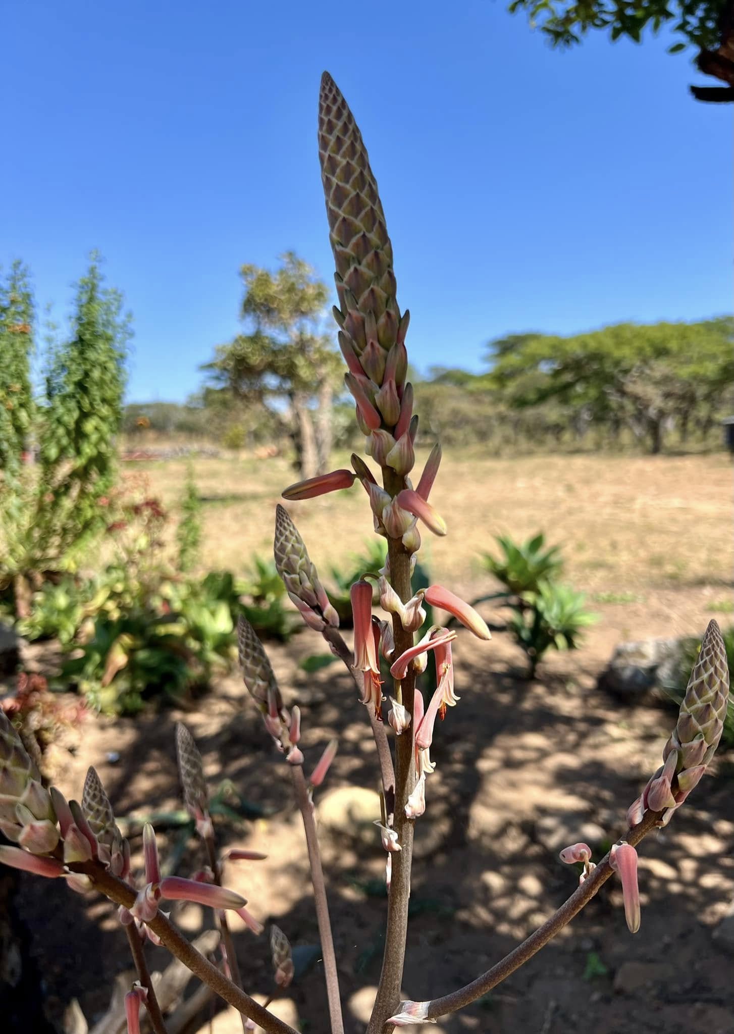 Aloe bicomitum 以其经典的芦荟莲座叶簇与较显眼的花序为特征,是热带东非植被中的一员。