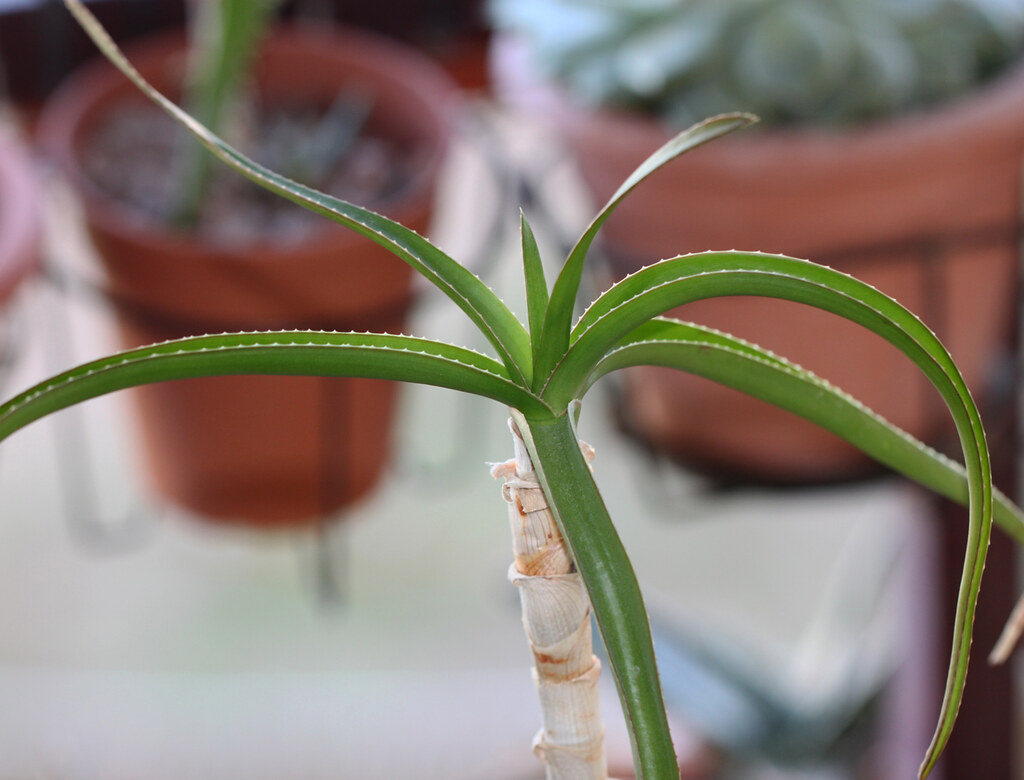叶片披针状,排列在茎干末端;叶片一般草绿色带微纵纹,叶缘具白色至浅色齿刺,齿长约 2 mm、间隔约 8–12 mm。