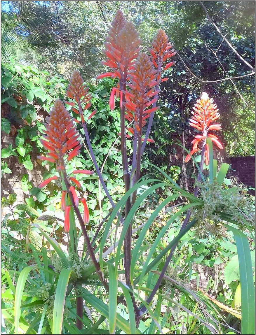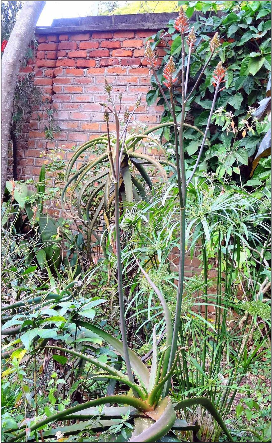莱恩离开马拉维时,露丝·姆塔万吉女士位于马拉维布兰太尔新兰兹的私人花园里还留有一株犬牙根(A. canis)植物。此外,她还向南非的一位种植者分发了50粒种子,但这些种子并未发芽,很可能是杂交品种(G. Hayes,2015年6月16日和2020年1月17日通过电子邮件与我们中的一位(JT)的私人通信)。姆塔万吉女士家花园里的这株植物目前仍在栽培中(S. Lane,2020年1月10日通过电子邮件与我们中的一位(GFS)的私人通信),姆塔万吉女士也证实了这一点(2020年1月16日通过电子邮件与我们中的一位(GFS)的私人通信)。姆塔万吉指出,这株植物确实是莱恩牧师大约20年前(即2000年代初期)送给她的,并且一直定期开花(图4和图5),但至今尚未结出可育种子,这可能是因为该物种是自交不育的,就像大多数芦荟及其近缘种一样。这株植物不会产生侧芽,也无法进行无性繁殖。莱恩(2020年1月16日通过电子邮件与我们中的一位(GFS)的私人通信)指出,姆塔万吉对犬芦荟(A. canis)的繁殖经验与他的发现相符,也就是说,他送给姆塔万吉的这株植物,以及该物种本身,都不会产生侧芽,而且几乎不产生可育种子,至少在未进行异花授粉的情况下是如此。他唯一成功的繁殖方法是剪掉茎秆,结果在切口处长出了一些新芽。