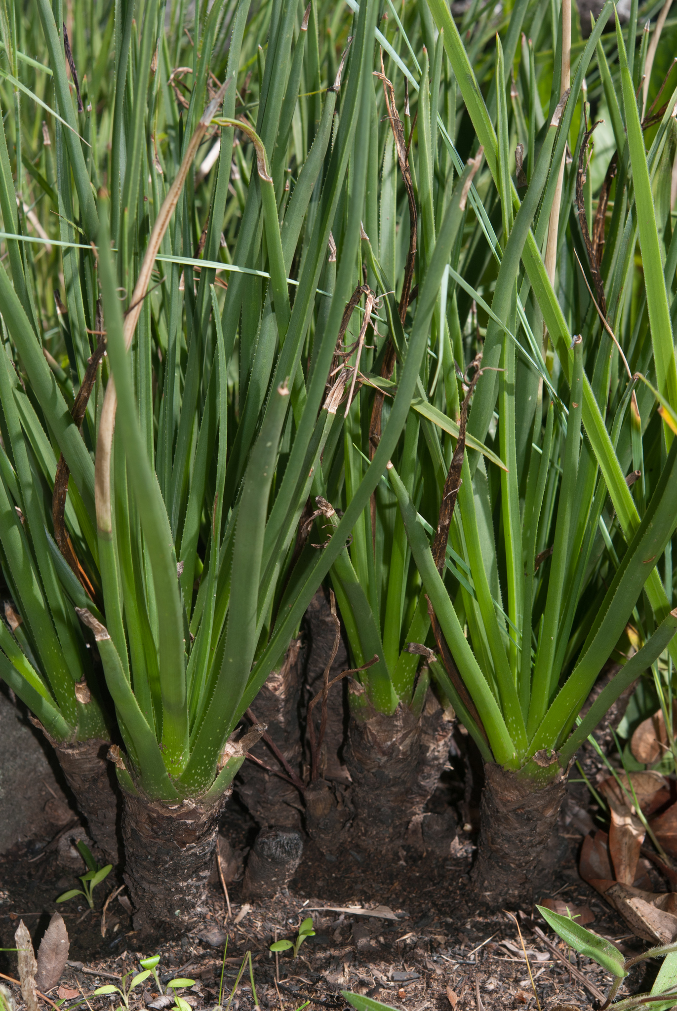 叶片 15–20 片,长可达 约 37 cm,宽 5–8 mm;上表面灰绿色至钝绿色,基部有时带少量散在白点,叶缘具微小齿刺。
