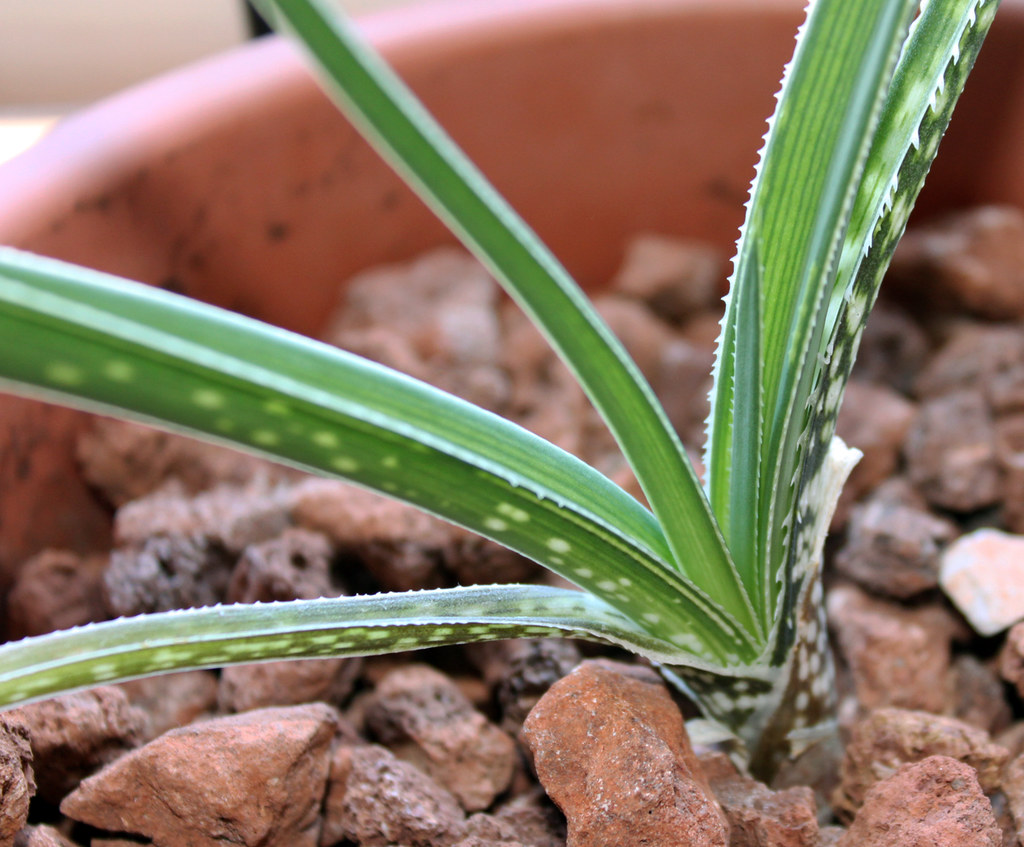 叶截面与边缘:叶片呈V形或明显龙骨状(keeled),质地略软,上下叶面平滑;边缘为窄白色肉质边缘,具白色齿刺(1–2 mm),齿分布较密。