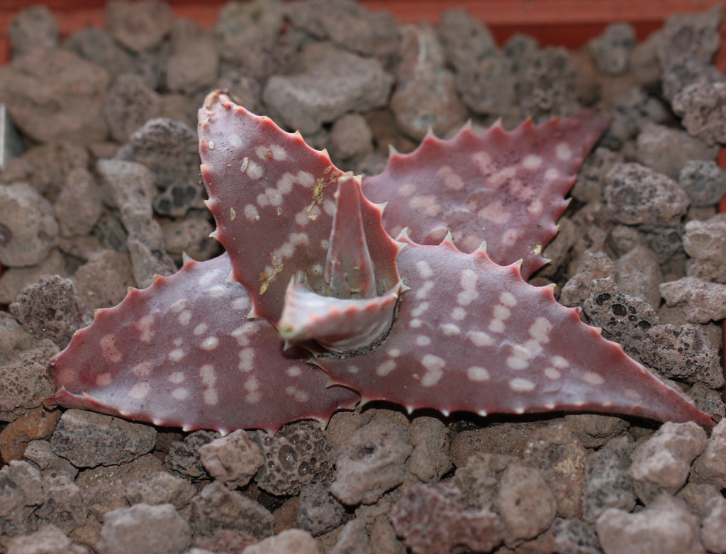叶面有白色延长斑点或不规则斑点,叶缘具小而尖锐的白色齿刺(齿长约 1–2 mm,间隔约 5–8 mm)。