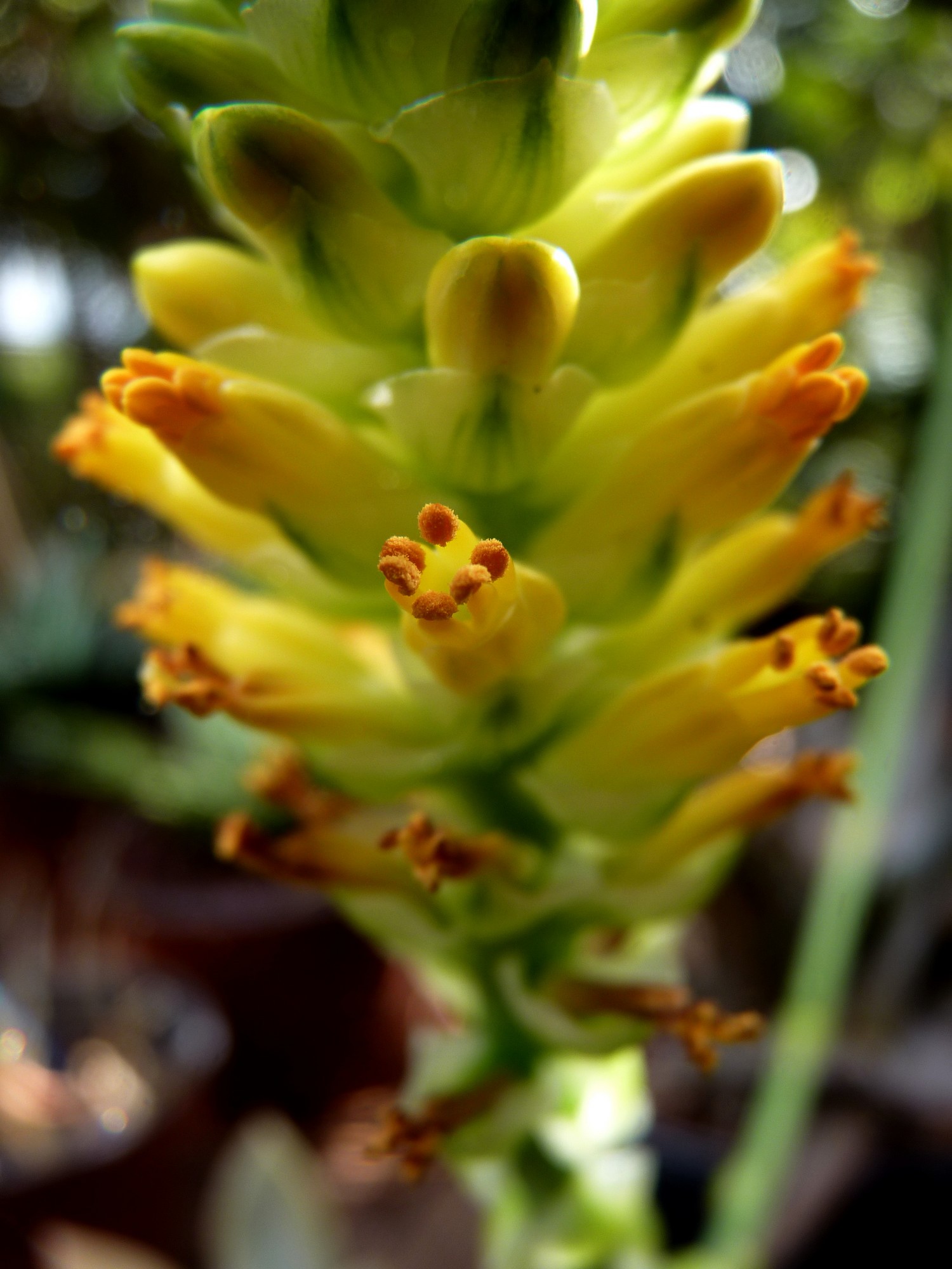花冠呈管状钟形,外侧为绿黄色,末端渐变为橙黄色;长度约 10 mm,雄蕊与雌蕊延伸约 3 mm 出花冠。