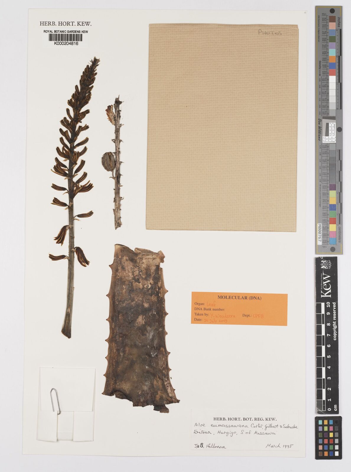 Aloe eumassawana 是一种原产于非洲东北部干旱区域的多肉芦荟属(Aloe)植物,隶属于天门冬科(Asphodelaceae)。该物种由植物学家 Susan Carter、M. G. Gilbert 和 Sebsebe Demissew 于 1996 年在 Kew Bulletin 上首次描述发表,名称取意于“真正来自 Massawa(马萨瓦)”——区别于早期误归类为 Aloe massawana的异地材料。它被权威分类资源 Plants of the World Online(Kew Science) 接受为有效学名。