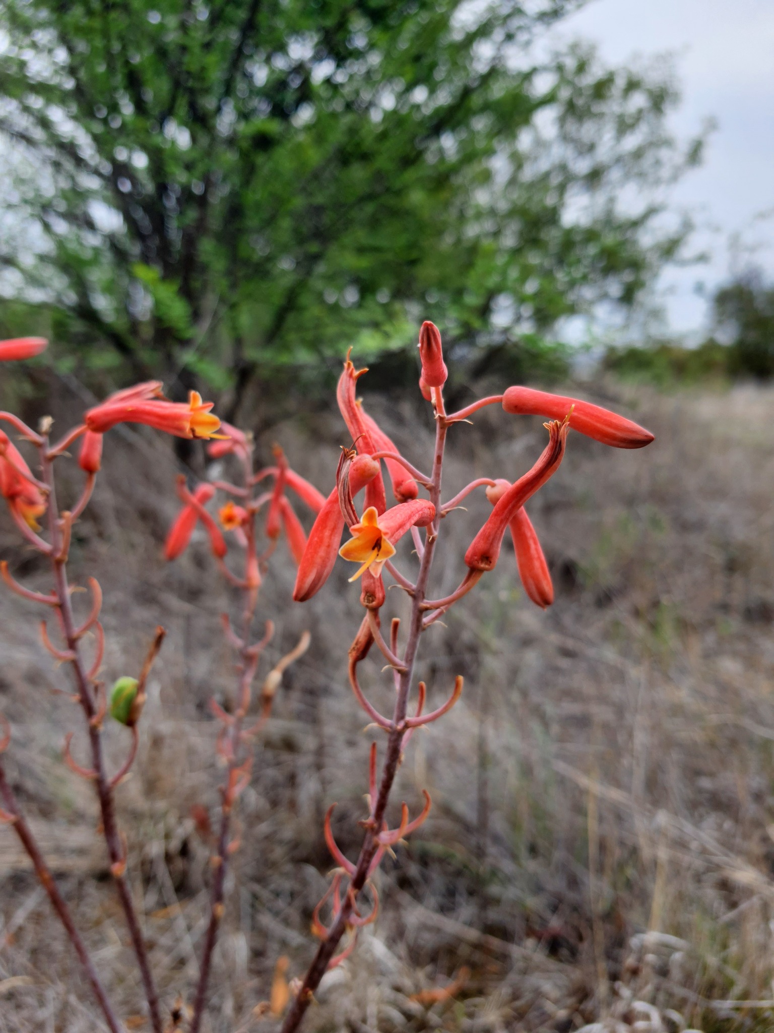 花朵呈管状,颜色从珊瑚粉红至暗红,长度约 19–30 mm,排列在集中或圆锥状花序穗上。