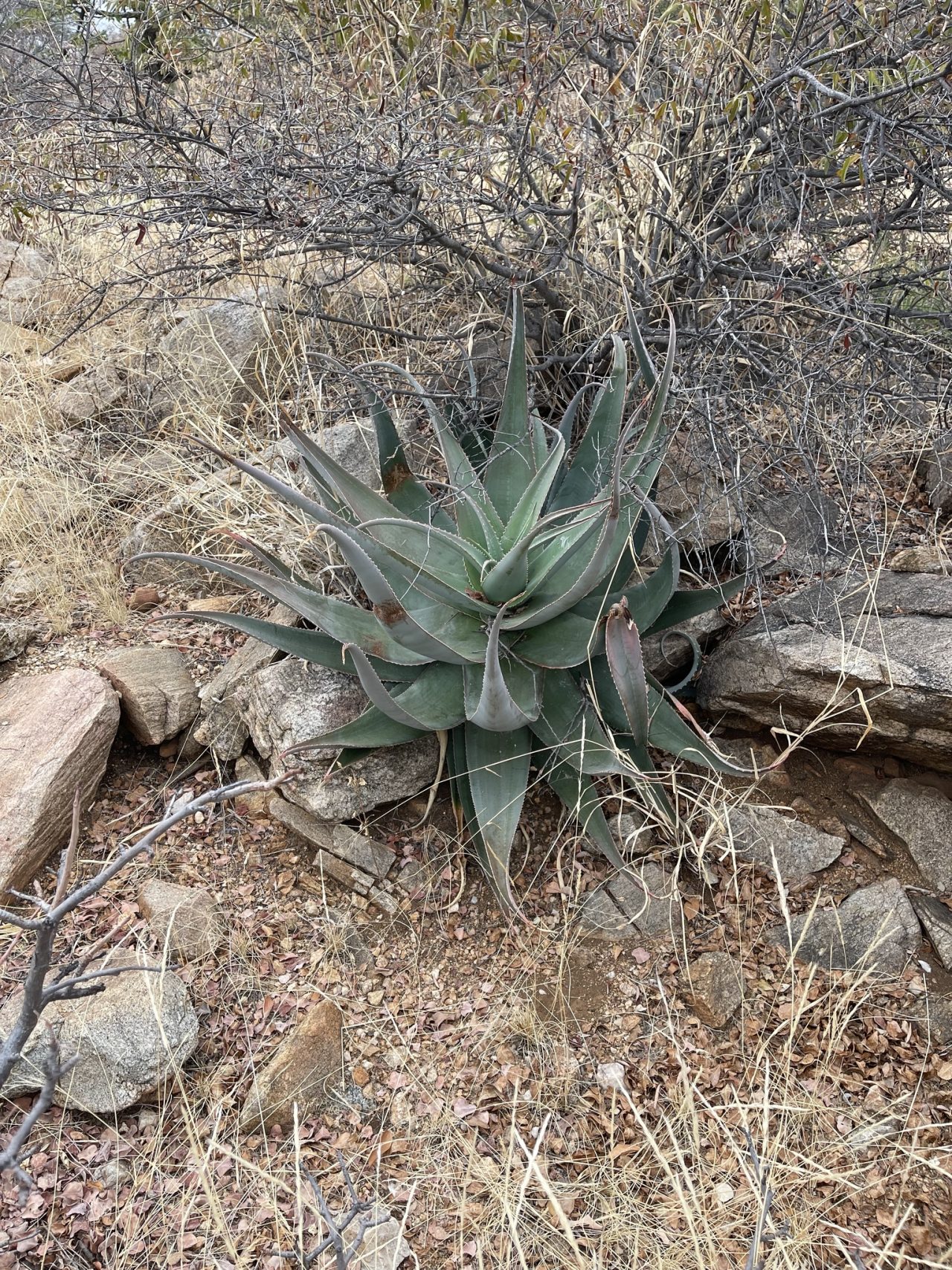 蓝绿或灰绿,在干燥环境下叶色可能带粉红晕;叶缘具白色或淡色坚固齿刺