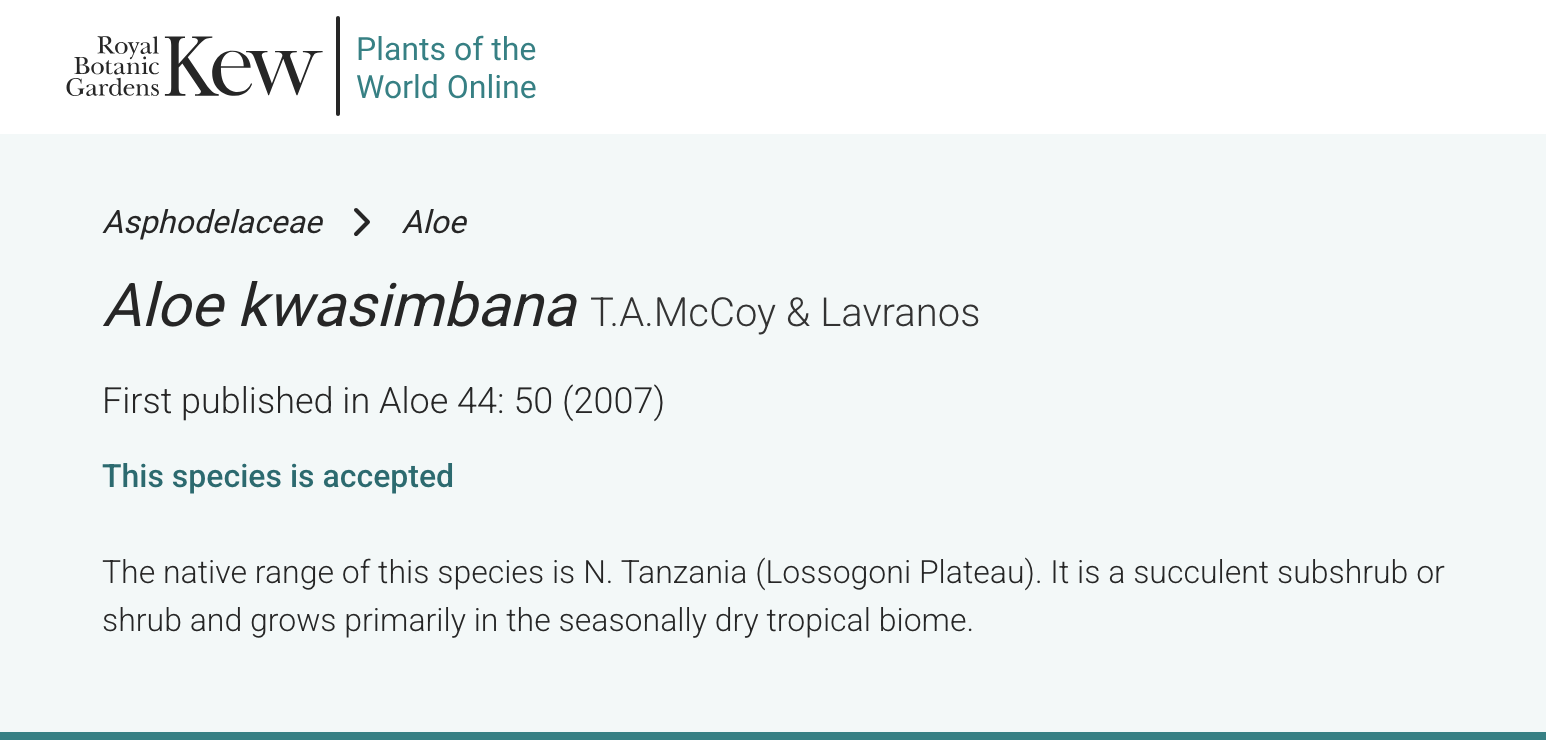 Aloe kwasimbana T.A.McCoy & Lavranos — Plants of the World Online (Kew). (Plants of the World Online)