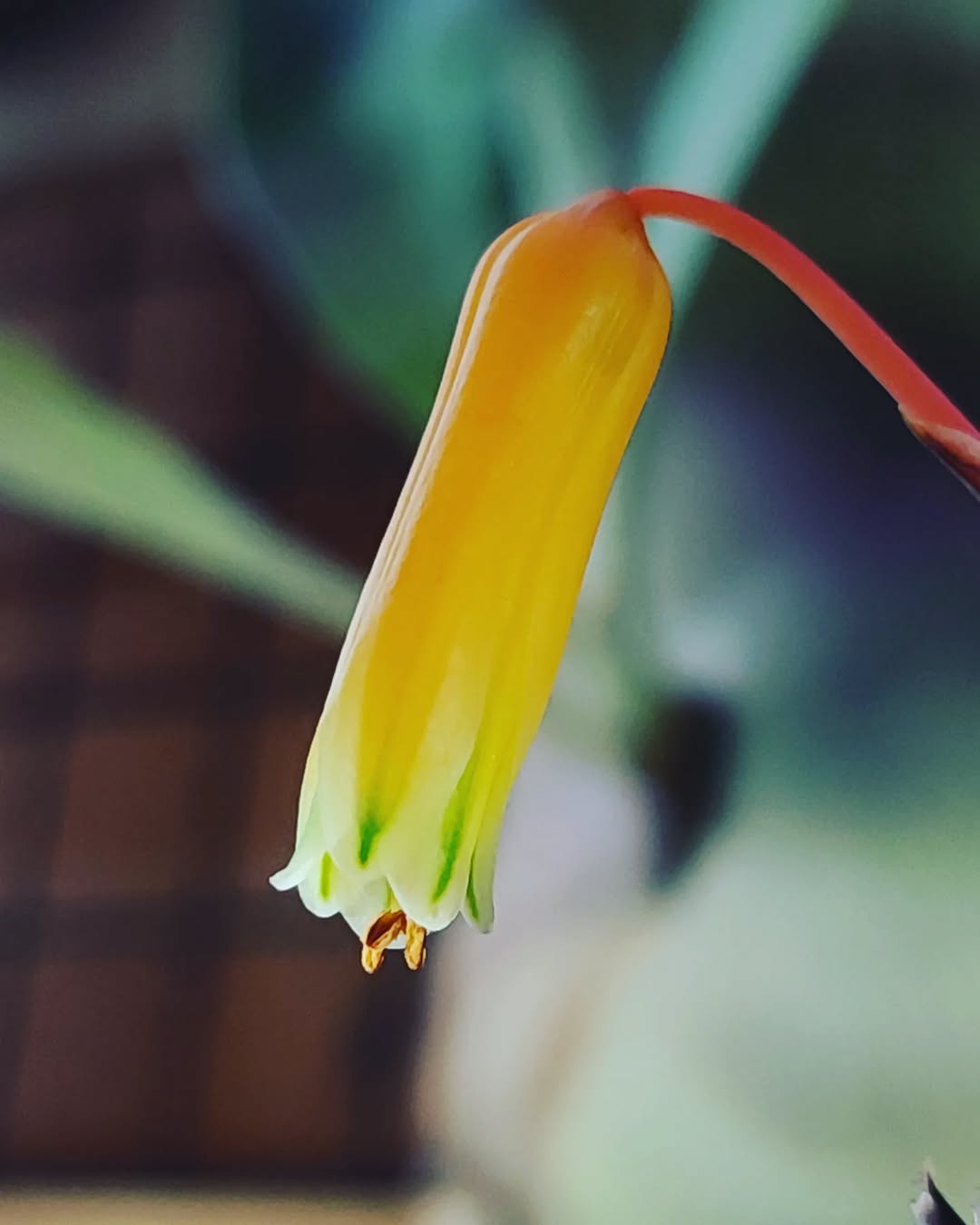单朵花为黄色管状,长约 25–27 mm,基部圆钝,上部略稍收缩且外花被片长度约 8–9 mm。