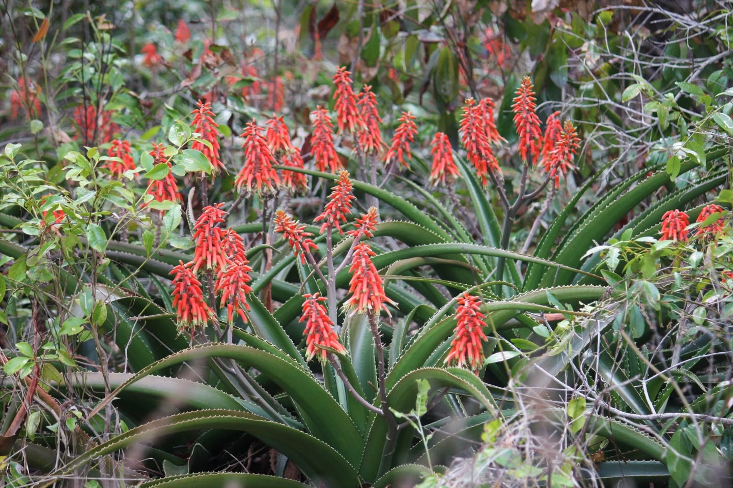 花序:开出多分枝圆锥花序,花色通常亮丽(红色或橙色系),典型芦荟花型。