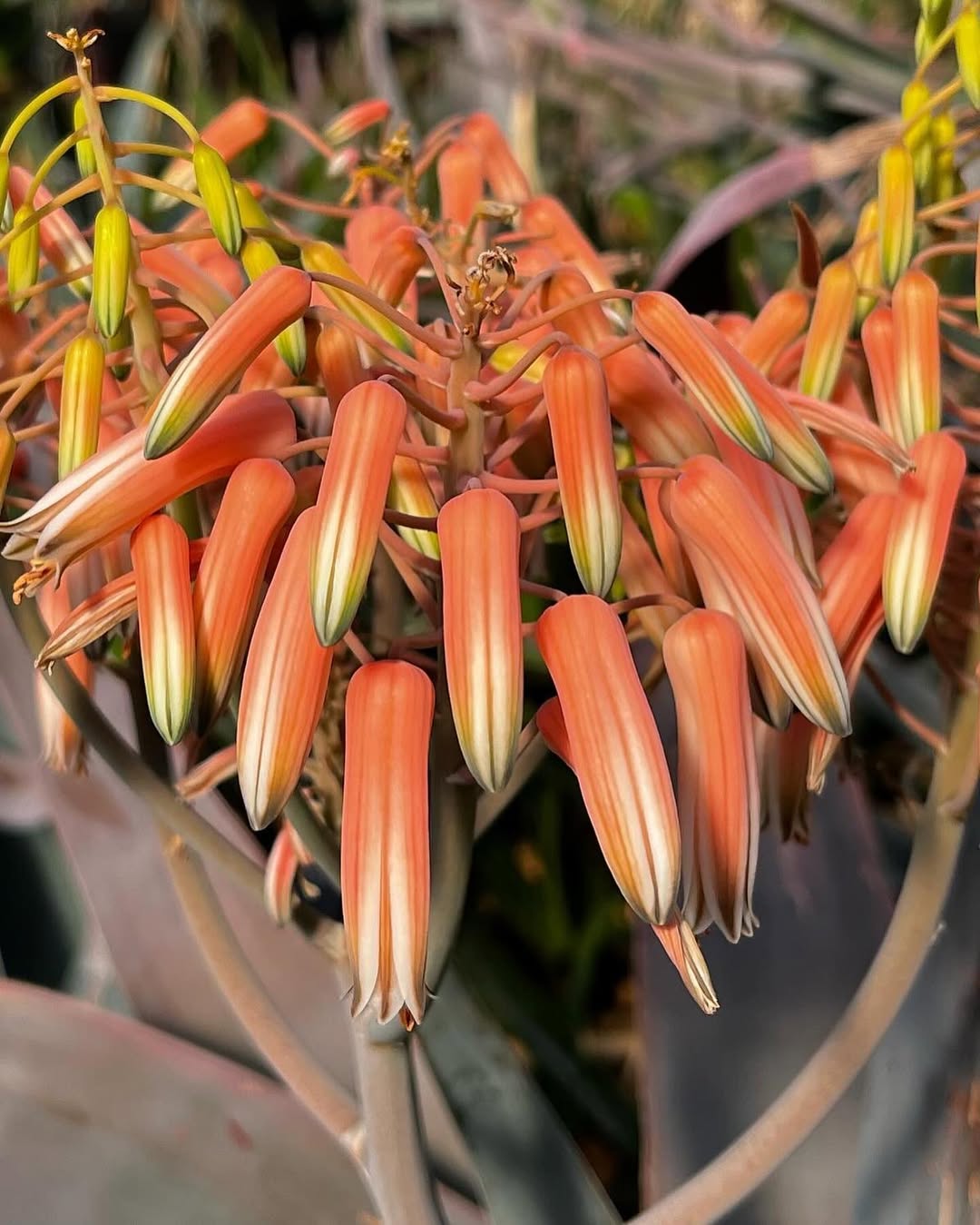 花序高达约 90 cm,具 最多 5 个分枝;花朵为淡粉色至白色的小管状花,长约 26–30 mm,雄蕊与雌蕊略伸出。