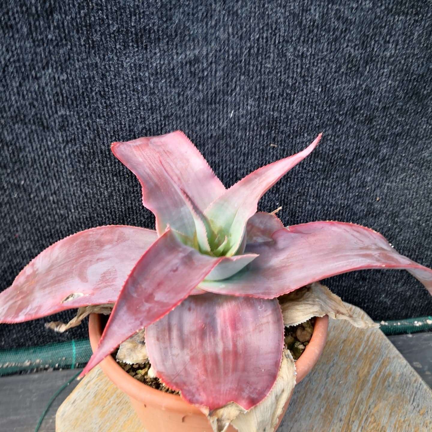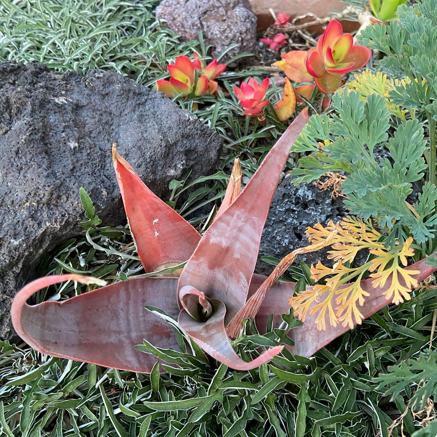 15–22 片,呈三角形(deltoid)披针形组成松散莲座,灰绿色叶片常带有紫色或红色调
