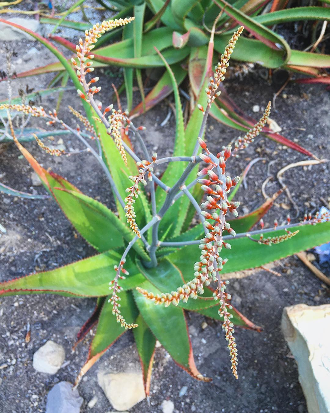 花葶常略倾斜,多分枝(报道约可达 ~9 个分枝),总体高度可达约 90 cm;总状或圆锥状花穗长约 20–25 cm,单朵花先基部为珊瑚红,向花口橙色或黄白色渐变,花长约 36 mm,雄蕊常微伸出。