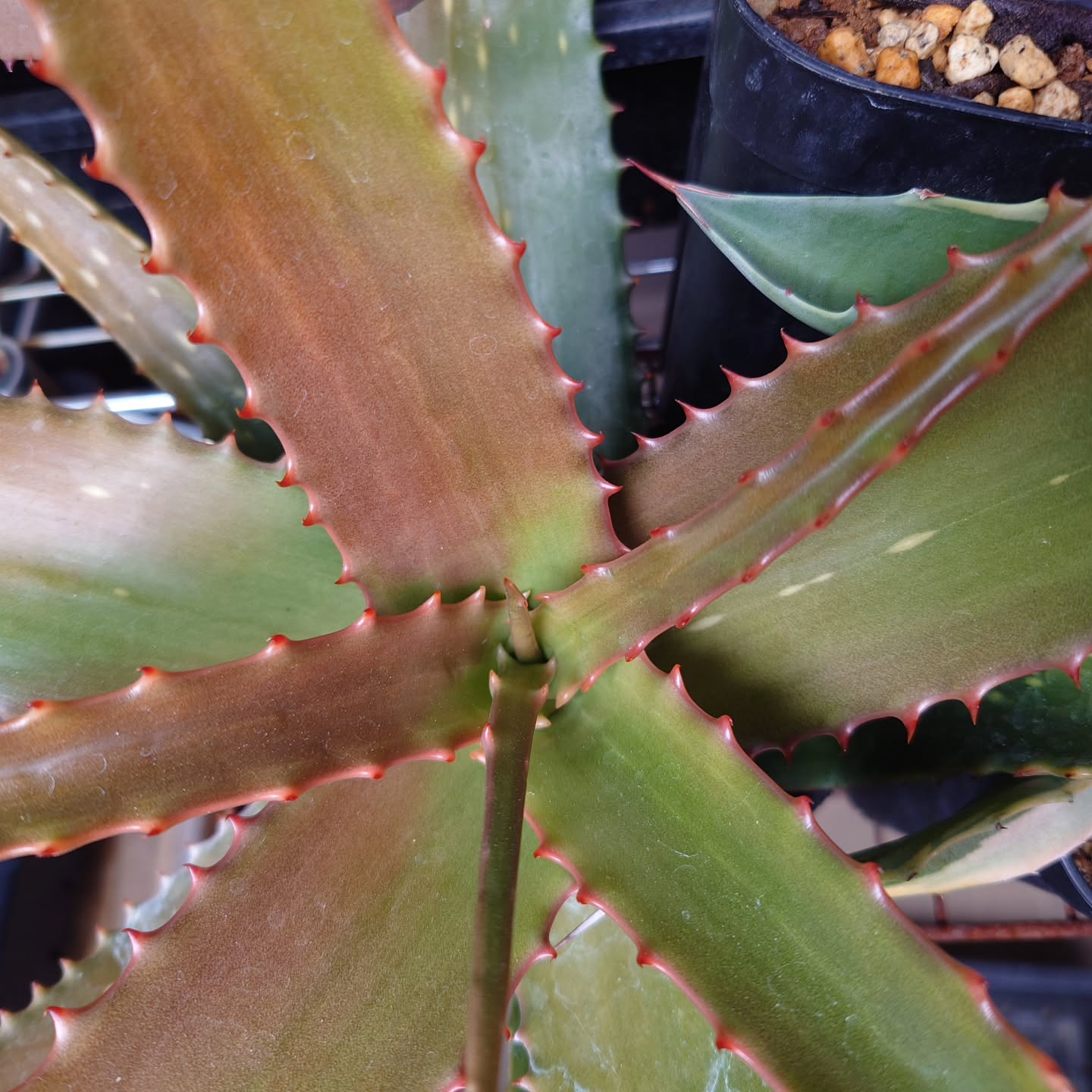 叶片:约 20–50 cm 长、可达 ~12 cm 宽(个体差异),深绿至橄榄绿,常带不显著的纵纹或浅色线斑;叶缘具明显坚硬的白色或黄褐色刺齿(齿长数毫米、间距数毫米)。