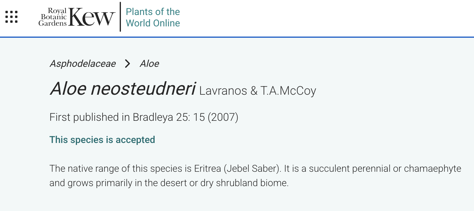 Aloe neosteudneri 是一种极具特色的多肉植物,归属于芦荟属 (Aloe) 和天门冬科(Asphodelaceae),其名称 neosteudneri 表示该物种在形态上接近 Aloe steudneri。(Aloe neosteudneri Lavranos & T.A.McCoy) 是权威分类资源认可的有效学名,最早由植物学家 John J. Lavranos 与 Thomas A. McCoy 于 2007 年在 Bradleya 杂志上描述发表。该种在园艺圈内因其姿态优雅的莲座叶片和高耸花序而受到关注。
