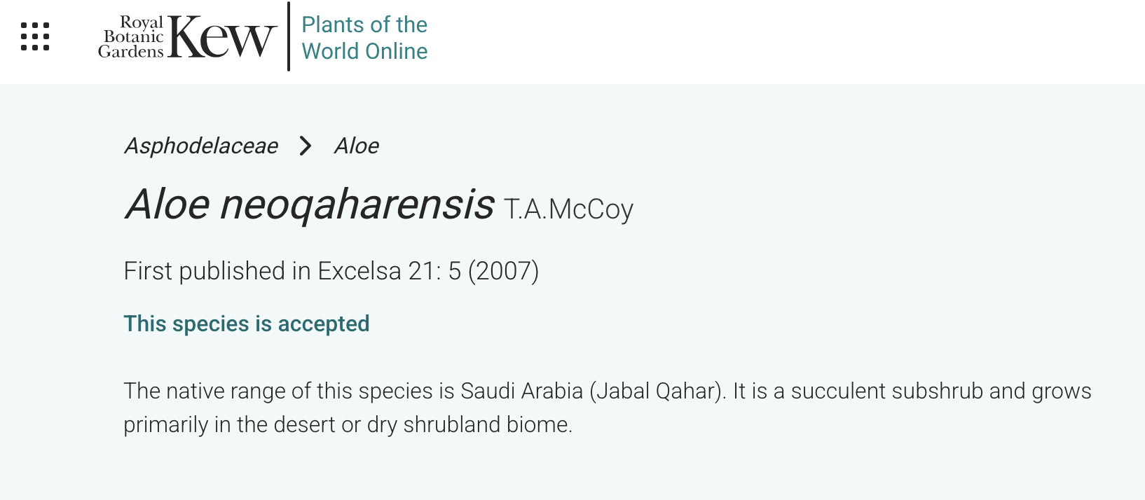 Plants of the World Online — Aloe neoqaharensis T.A.McCoy(确认分类与原产地). (Plants of the World Online)