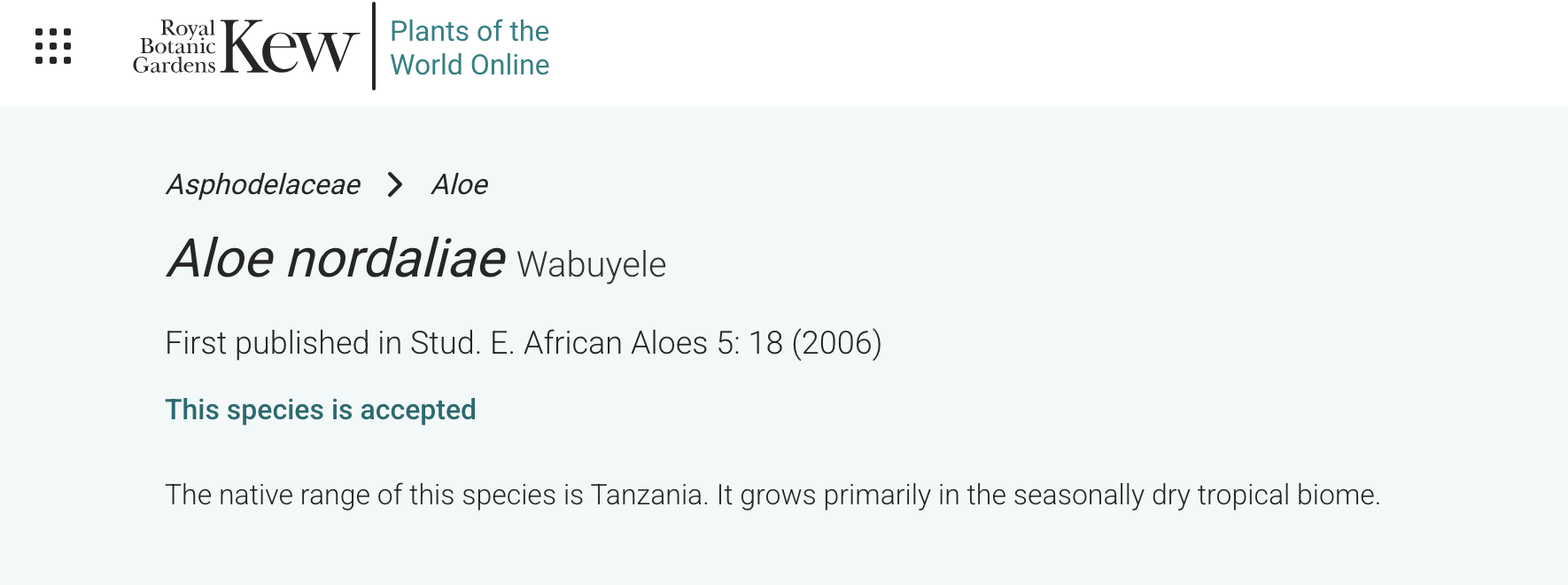 Plants of the World Online (Kew Science)Aloe nordaliae Wabuyele; 首次发表:Stud. E. African Aloes 5:18 (2006). (Plants of the World Online)