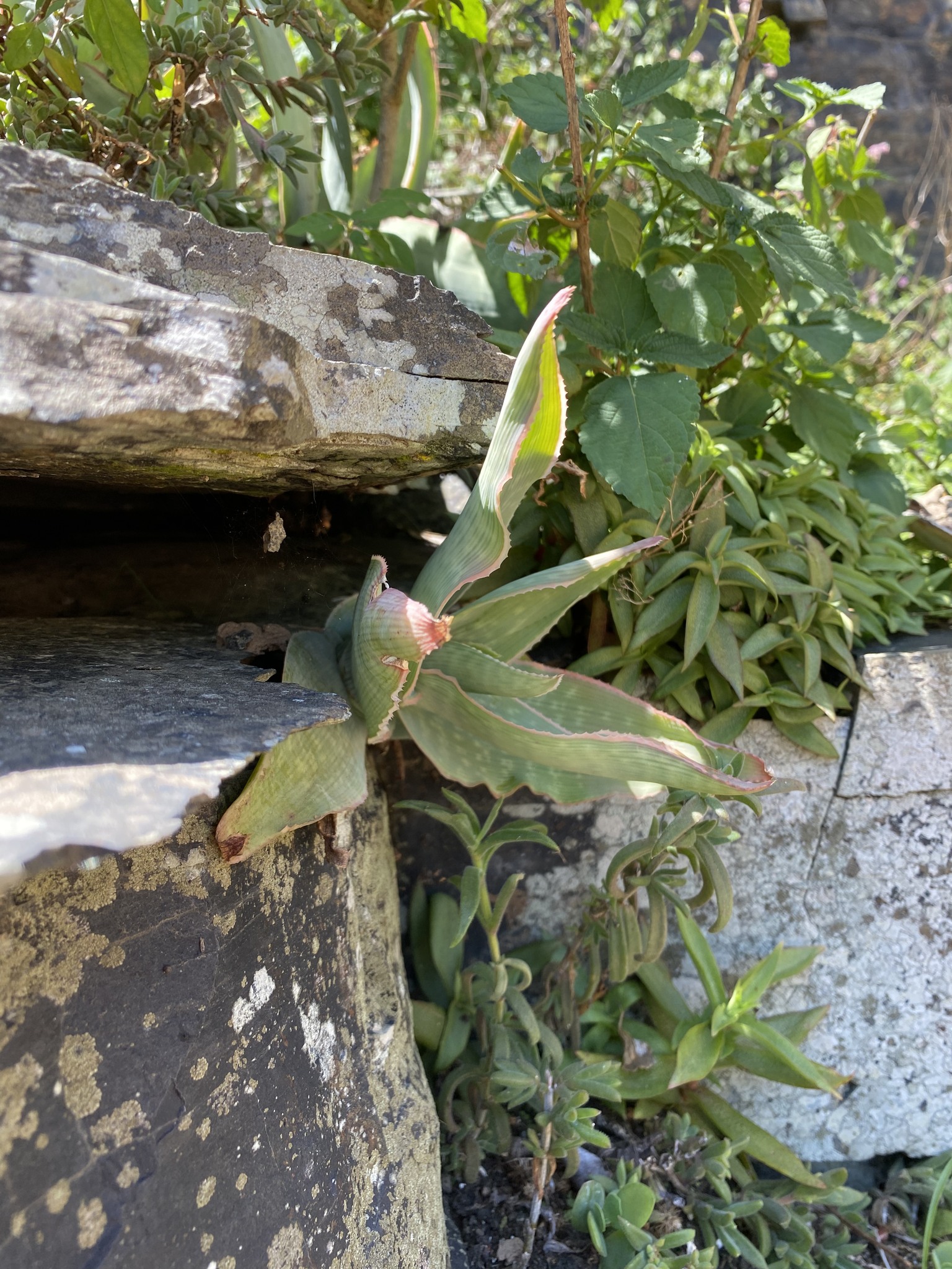 灰绿色至蓝绿色叶片带纵向线纹与浅色斑点;